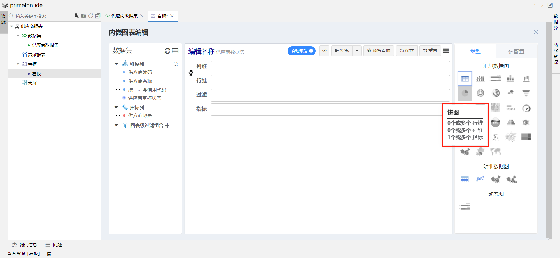饼图的设计需要一个或多个指标列才可以使用,在数据集中有提前准备好的指标列:供应商数量。