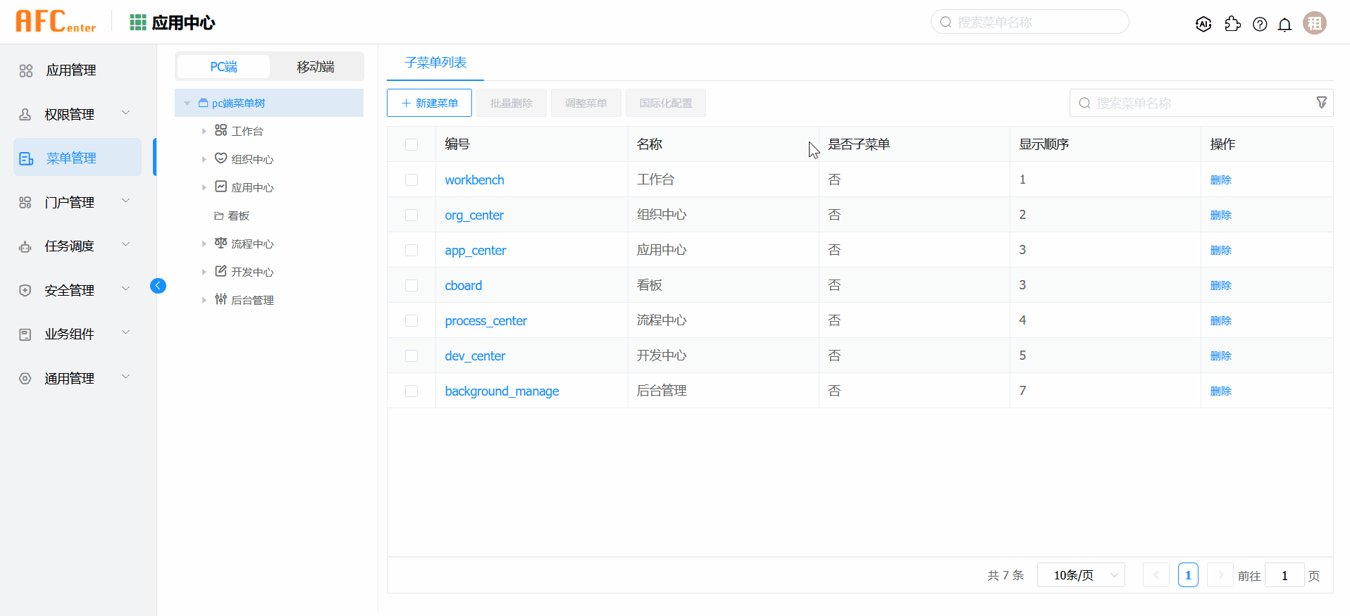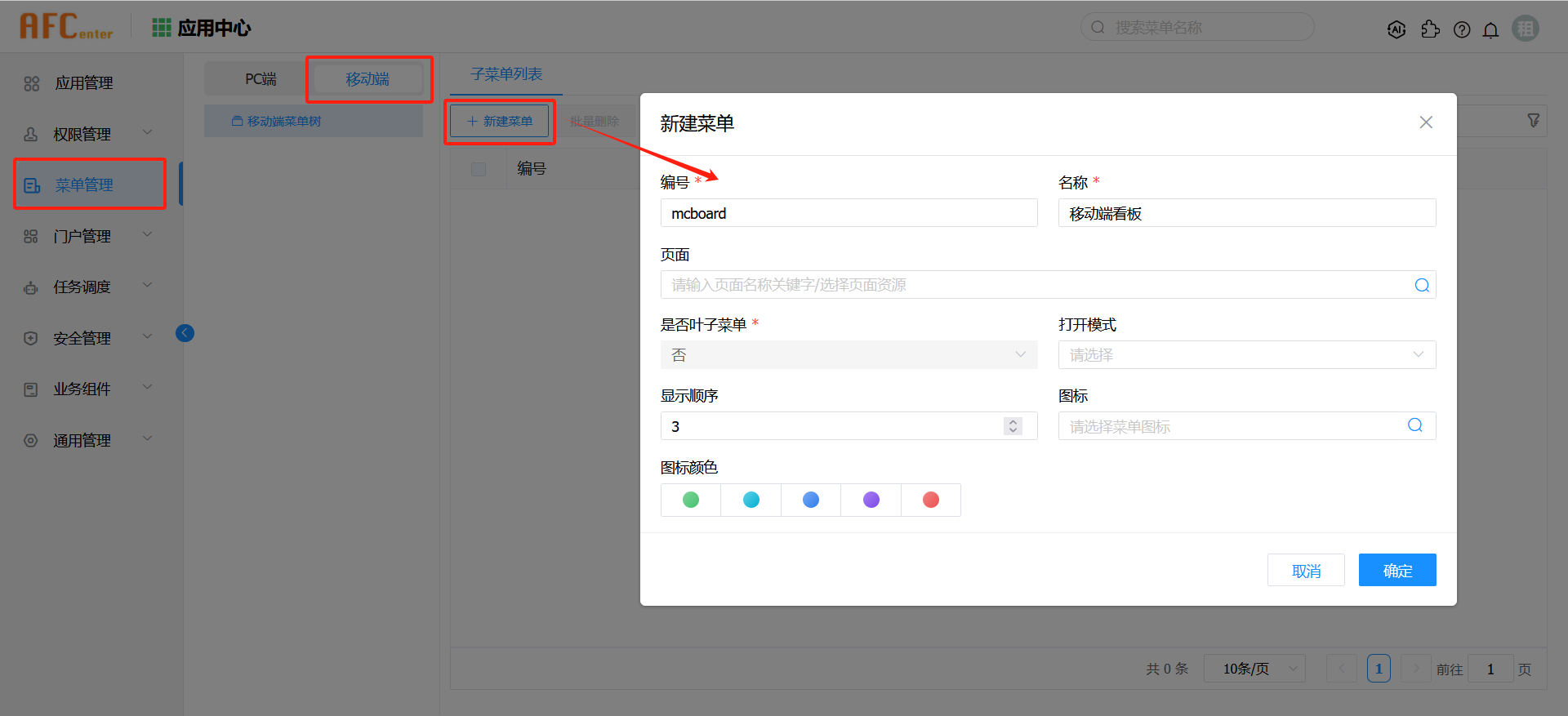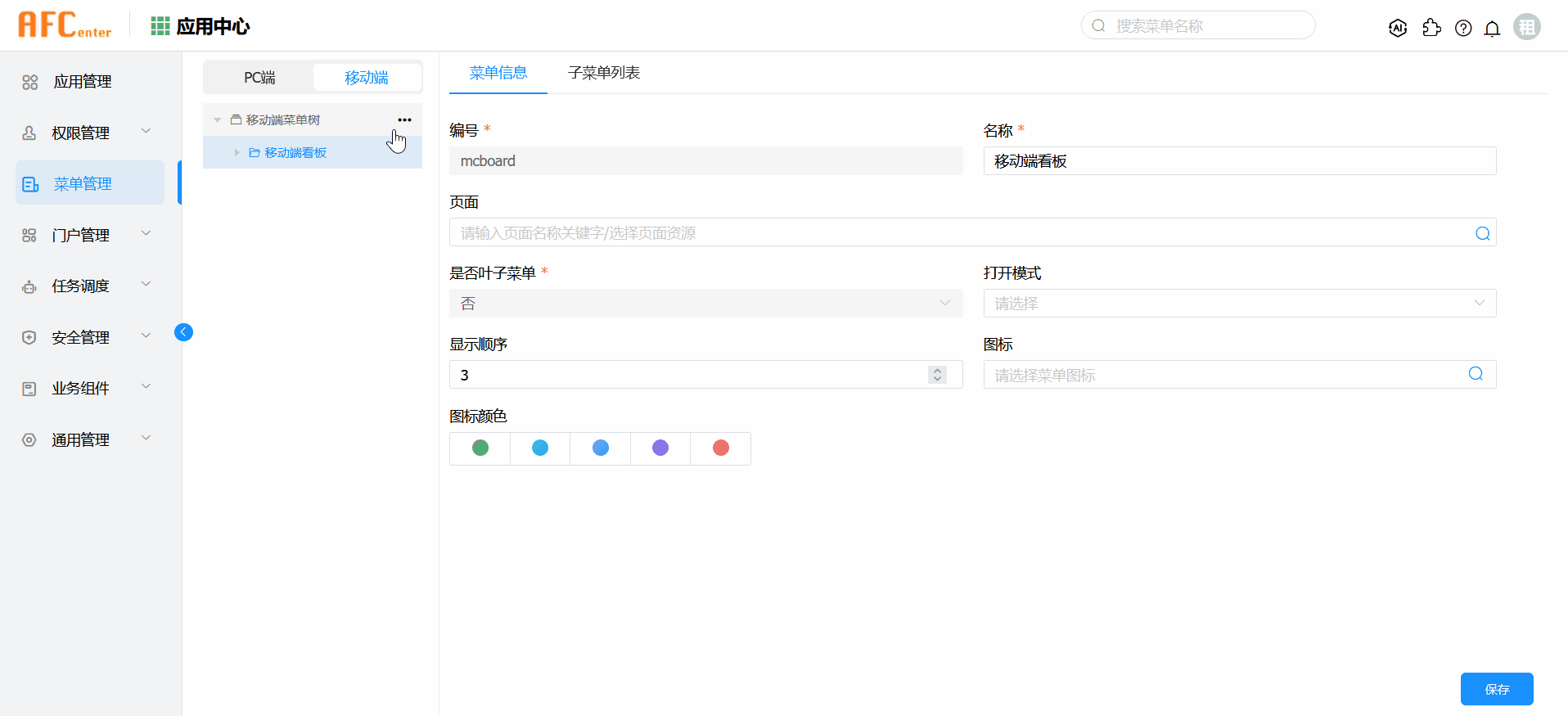 在应用中心-菜单管理-移动端菜单树下,点击新建菜单,创建一个移动端看板菜单。