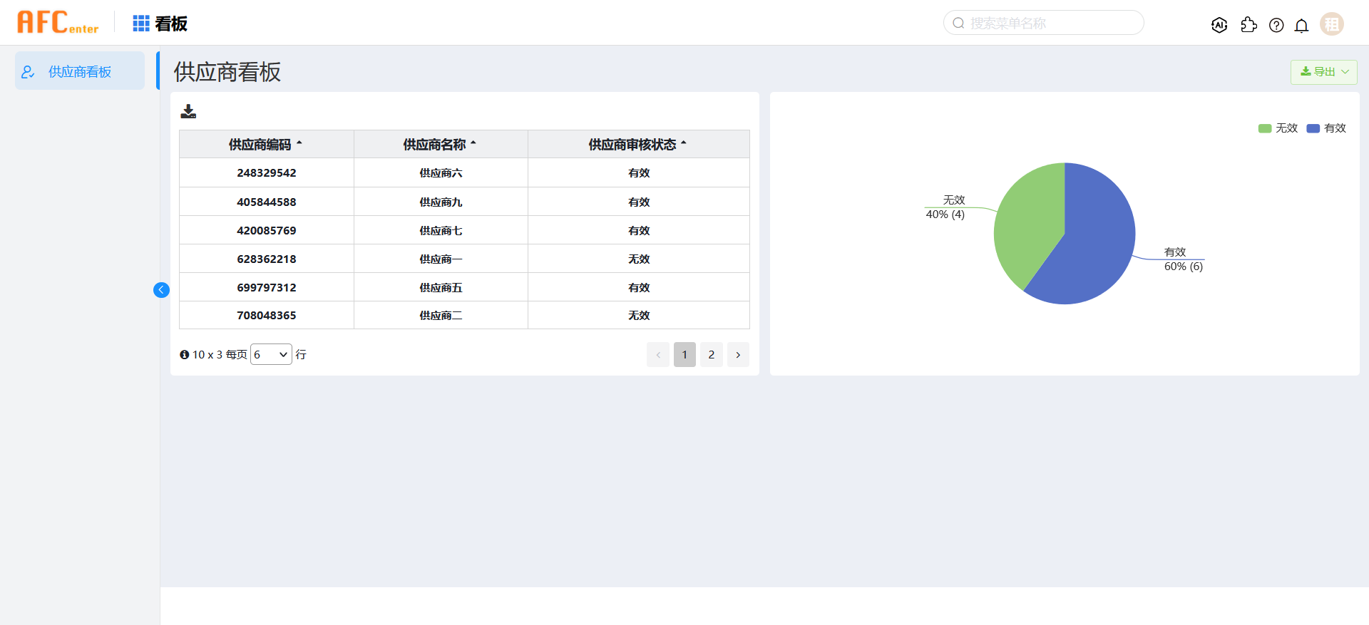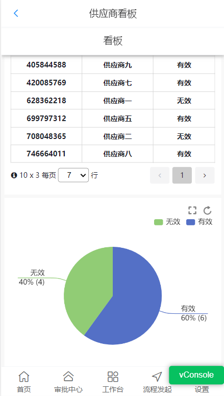 展示供应商总体的审核状态,需要用扇区把饼图分割,可以直观的反映供应商有效与无效的数量比例。