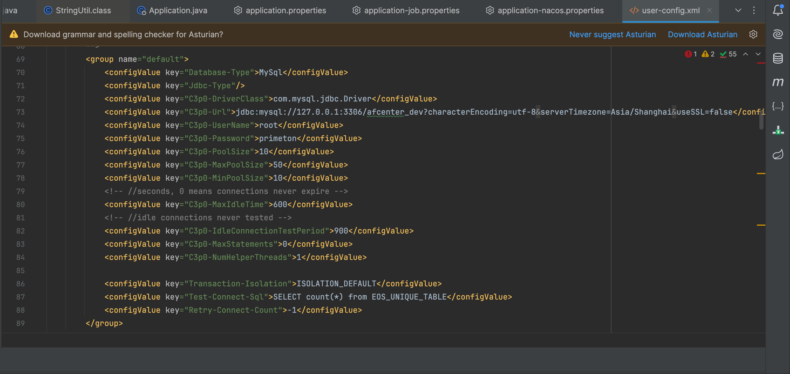 打开 com.primeton.gocom.afcenter.boot模块,找到src/META-INF/_srv/config/user-config.xml文件;找到数据库连接配置修改为自己的数据库连接配置即可;