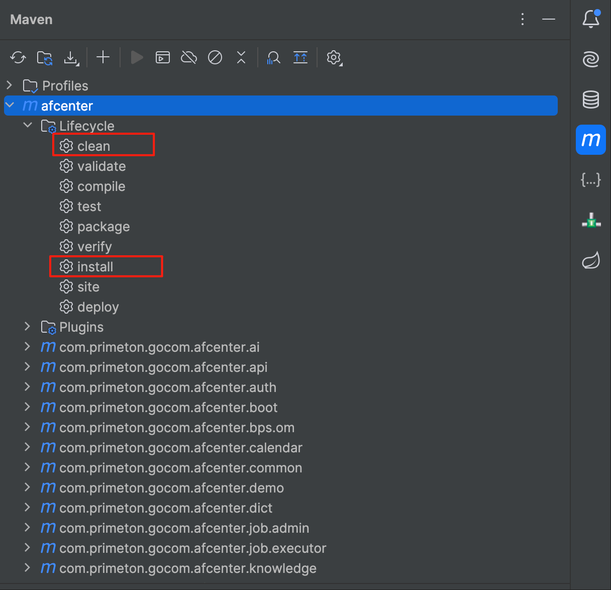 maven工具操作区中打开afcenter项目目录,Lifecycle中依次次点击clean,install编译项目;