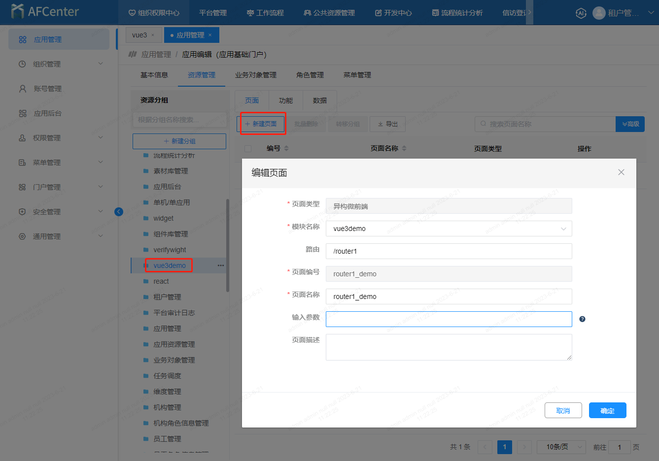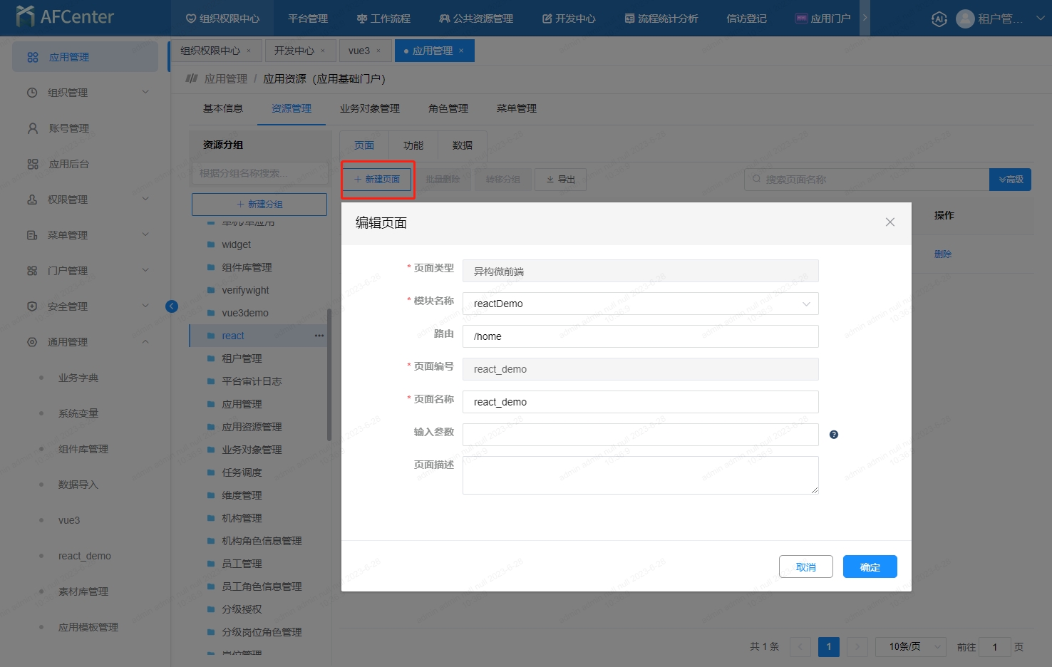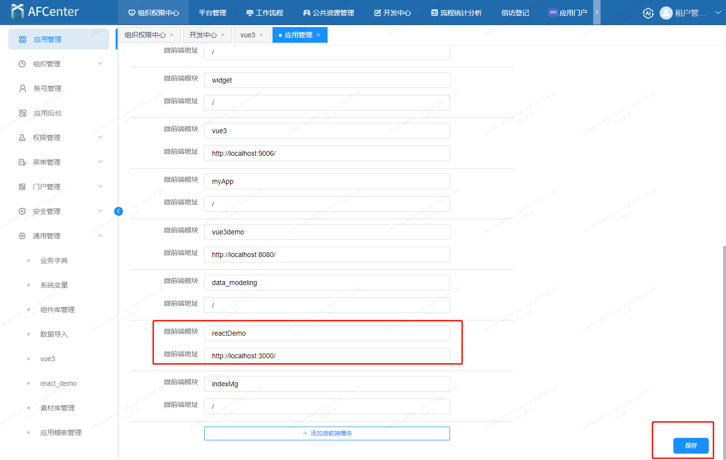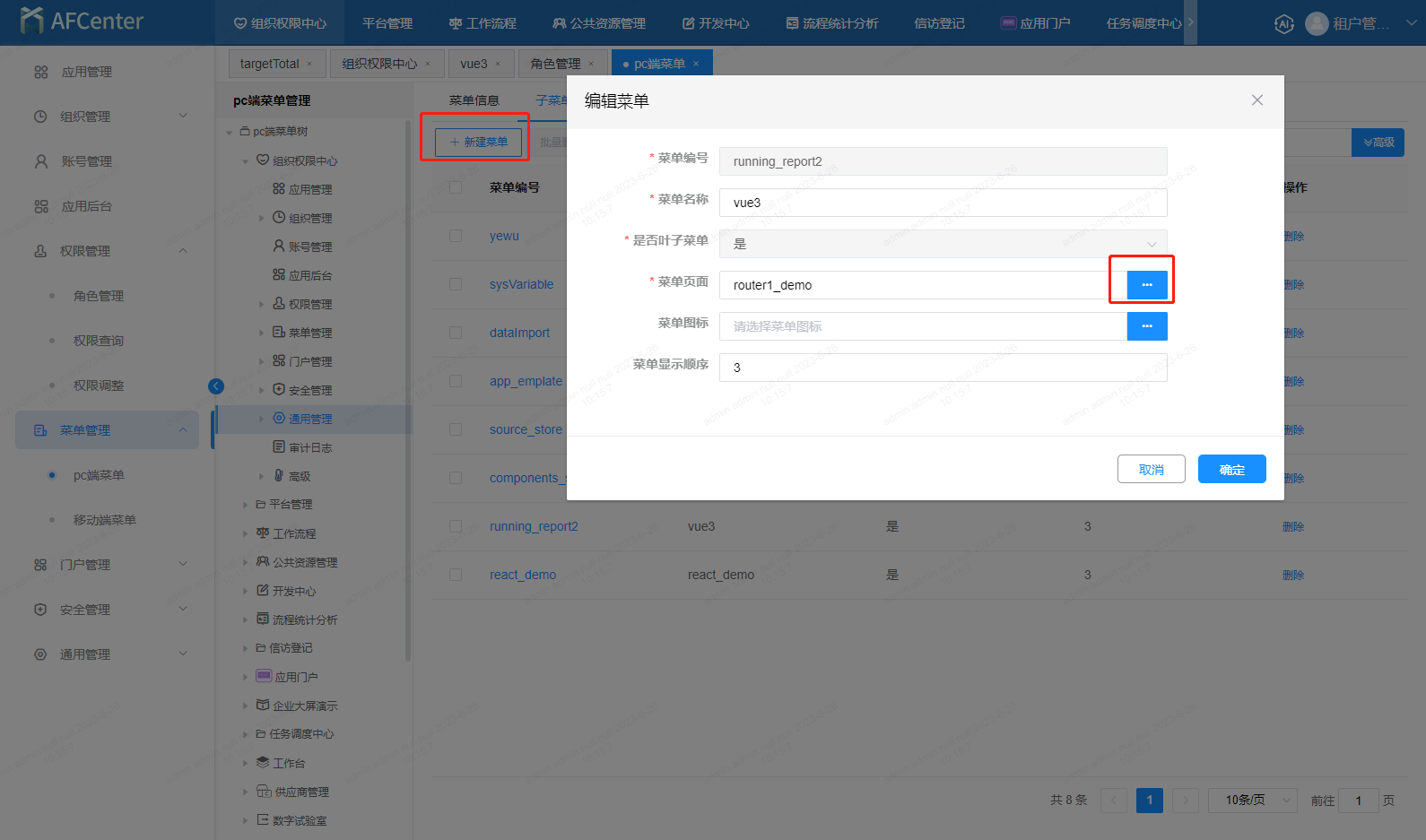 这里列举两个异构微前端页面挂载在afcenter菜单中展示的操作步骤,vue3和react类型项目。