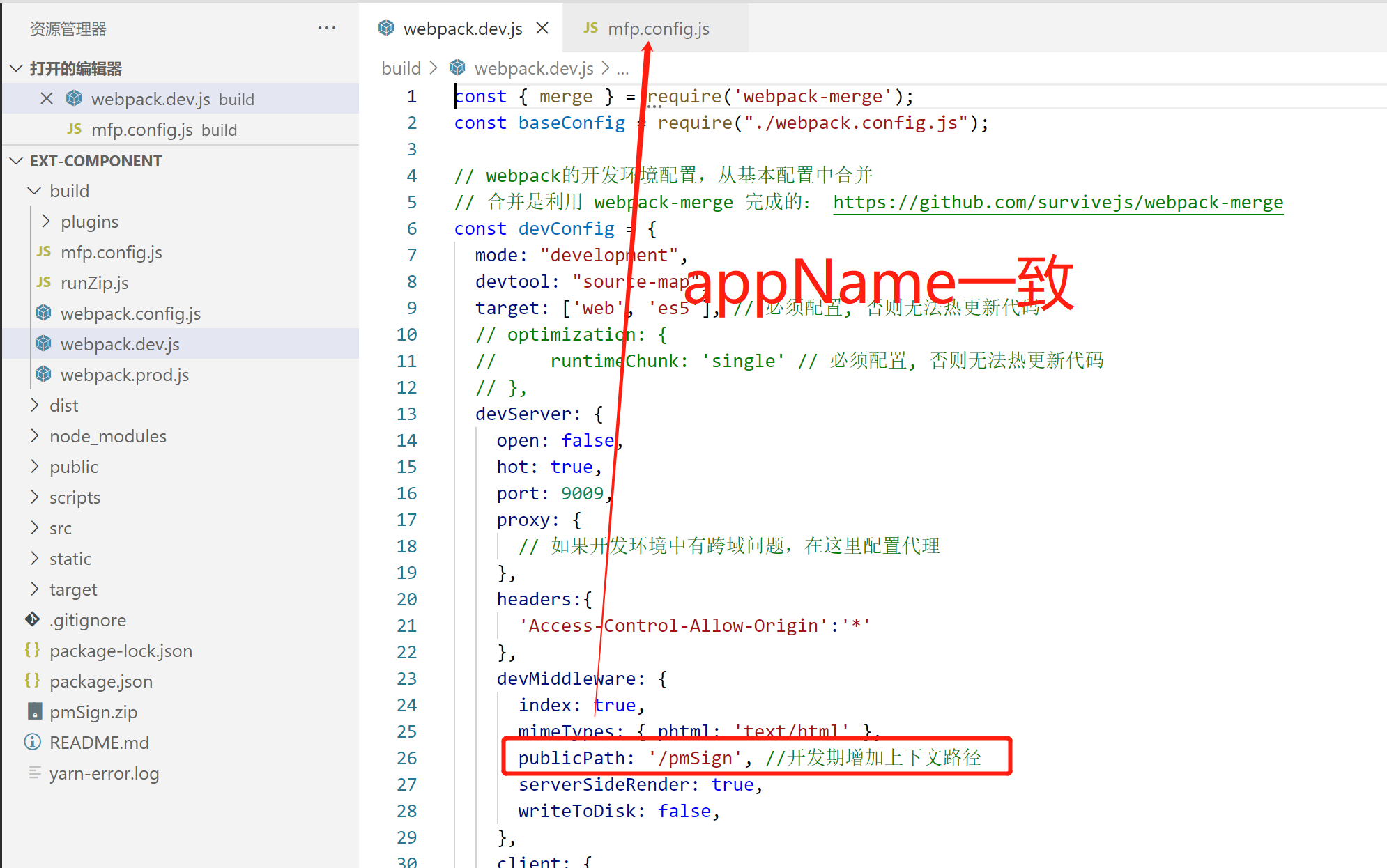 修改webpack.dev.js中publicPath,publicPath与mfp.config.js中appName一致