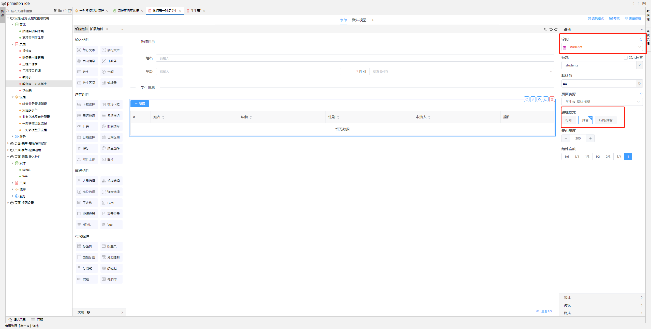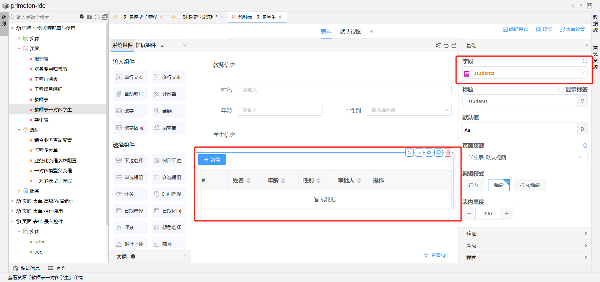 3.根据数据实体创建父流程表单页面,1端作为主流程页面,需要拖选子表格组件,绑定n端默认视图,子表格绑定数据实体n端字段,编辑模式选择弹窗,保存主流程。