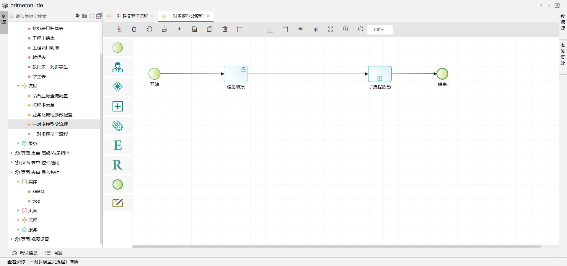 5.创建父流程,绑定刚刚创建的1端父流程表单,拖选子流程组件,这里需要注意的是,需要在子流程的上一个相邻环节为子流程定义参与者,否则就需要前端表单js自行定义参与者数据。