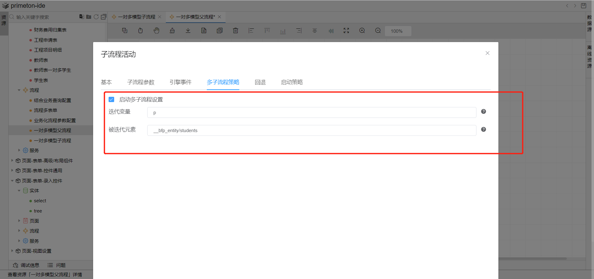 6.双击子流程活动组件,打开子流程配置页面,选择多子流程配置,勾选启动多子流程设置,迭代变量自定义参数p,被迭代变量来源自主表单中子表格绑定参数students,在流程中表单对象用__bfp_entity,所以这里被迭代变量是__bp_entity/students。