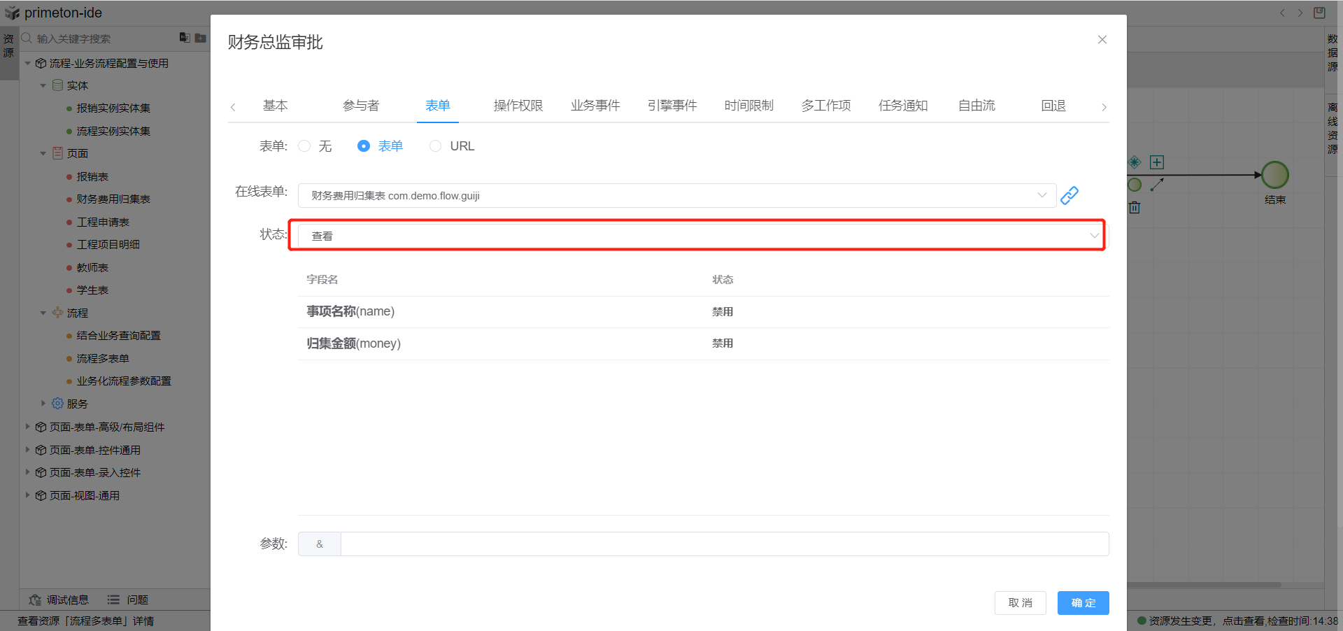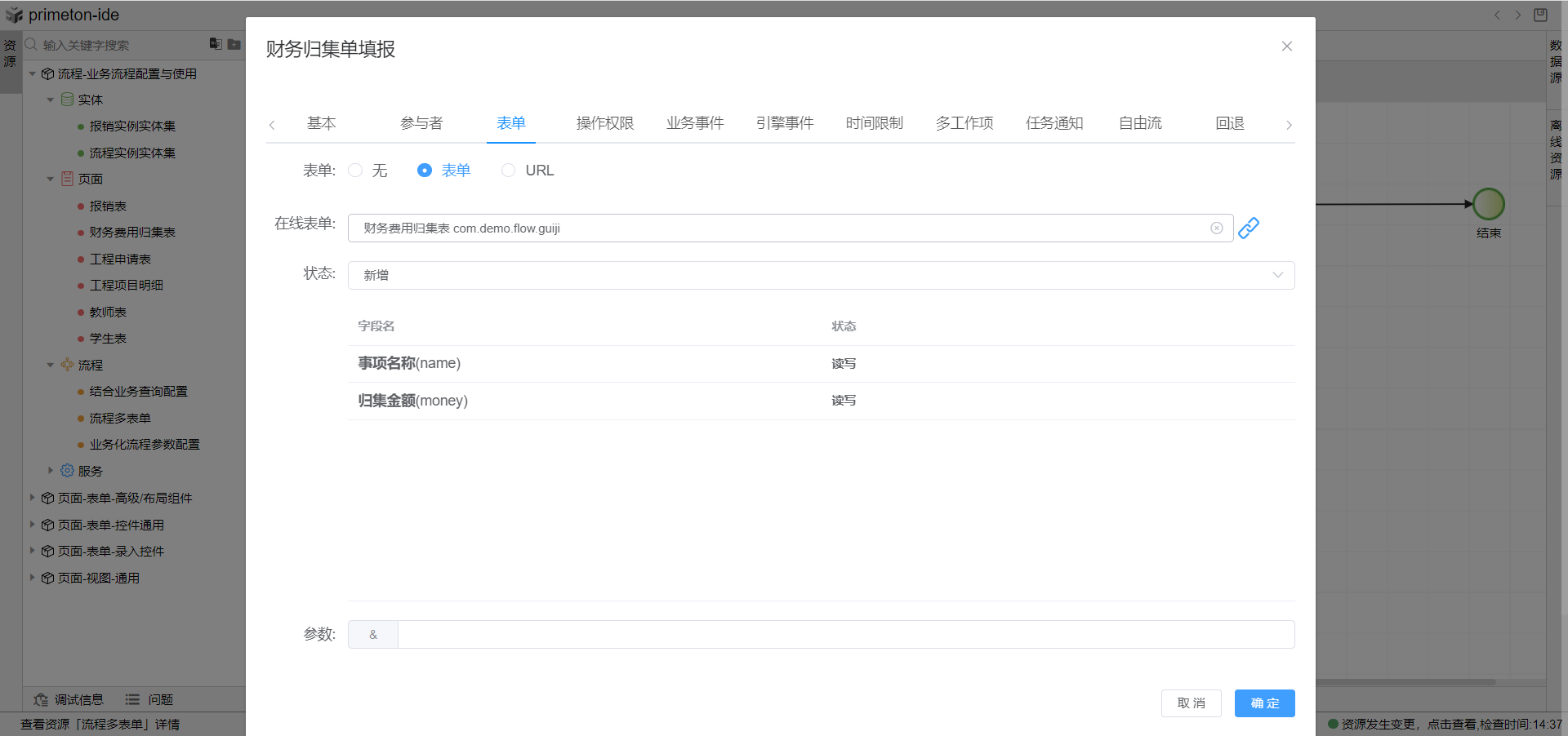 2.双击财务归集单填报图元,打开图元属性修改弹窗,选择表单tab页,点击在线表单下拉框选择财务归集表单,选择表单状态为新增,点击确定关闭弹窗完成财务归集单填报环节表单配置。