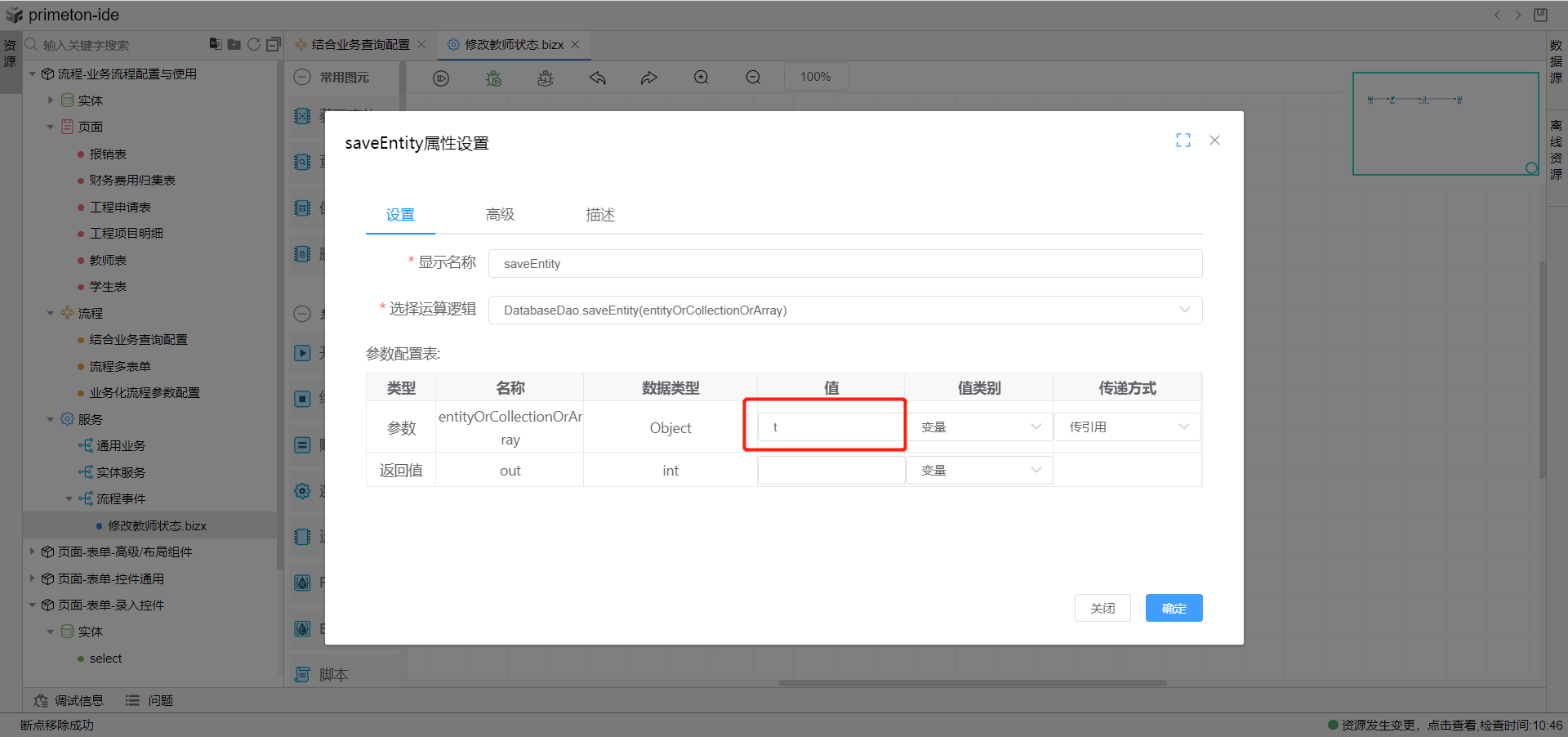 3.使用逻辑流图元,双击打开逻辑流图元,使用save方法,传入变量t给逻辑流,点击保存关闭弹窗即完成逻辑流配置。