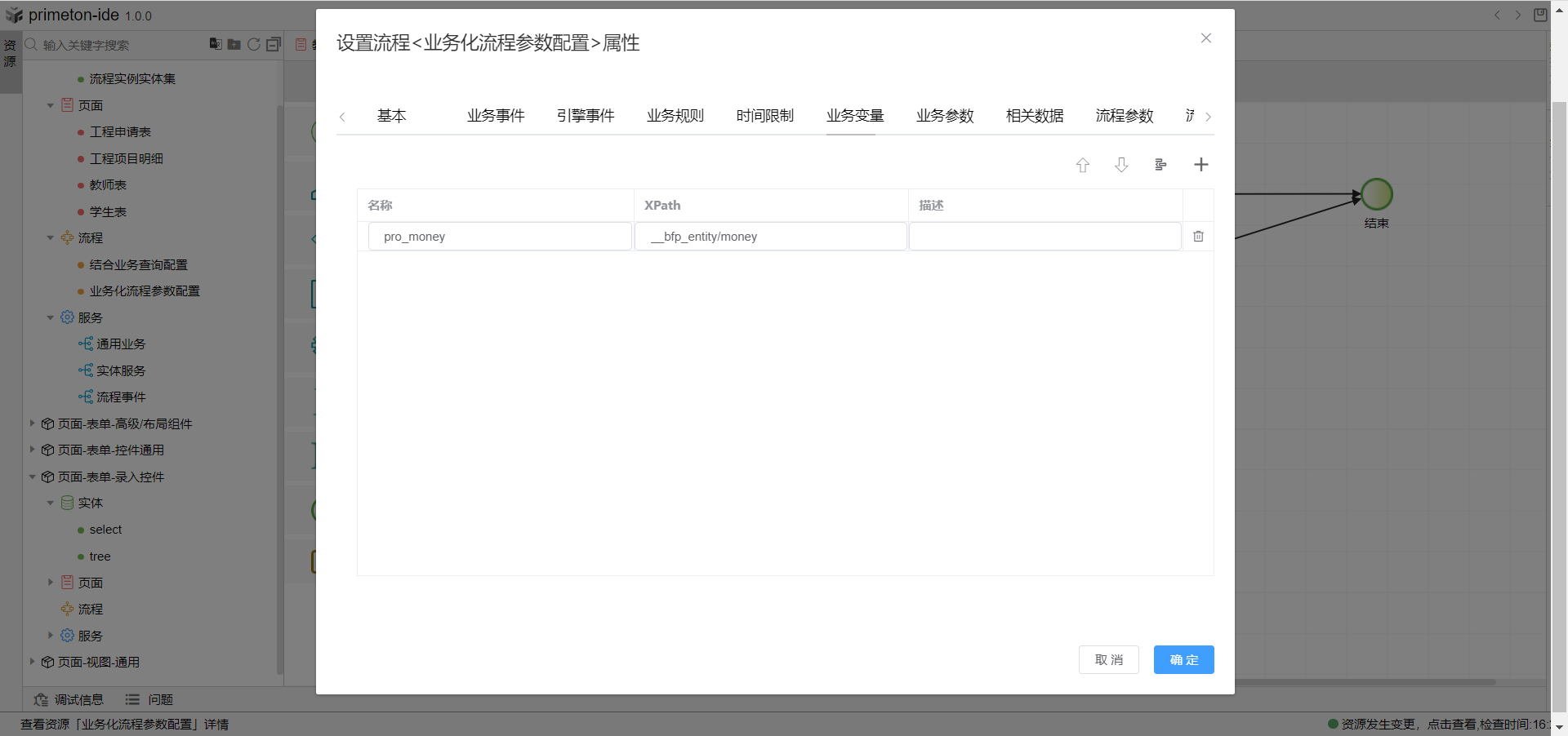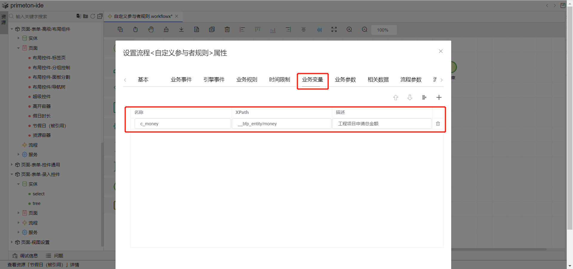 2.选择业务变量tab页,定义一个业务变量,xPath就是业务表单属性值在相关数据区路径。