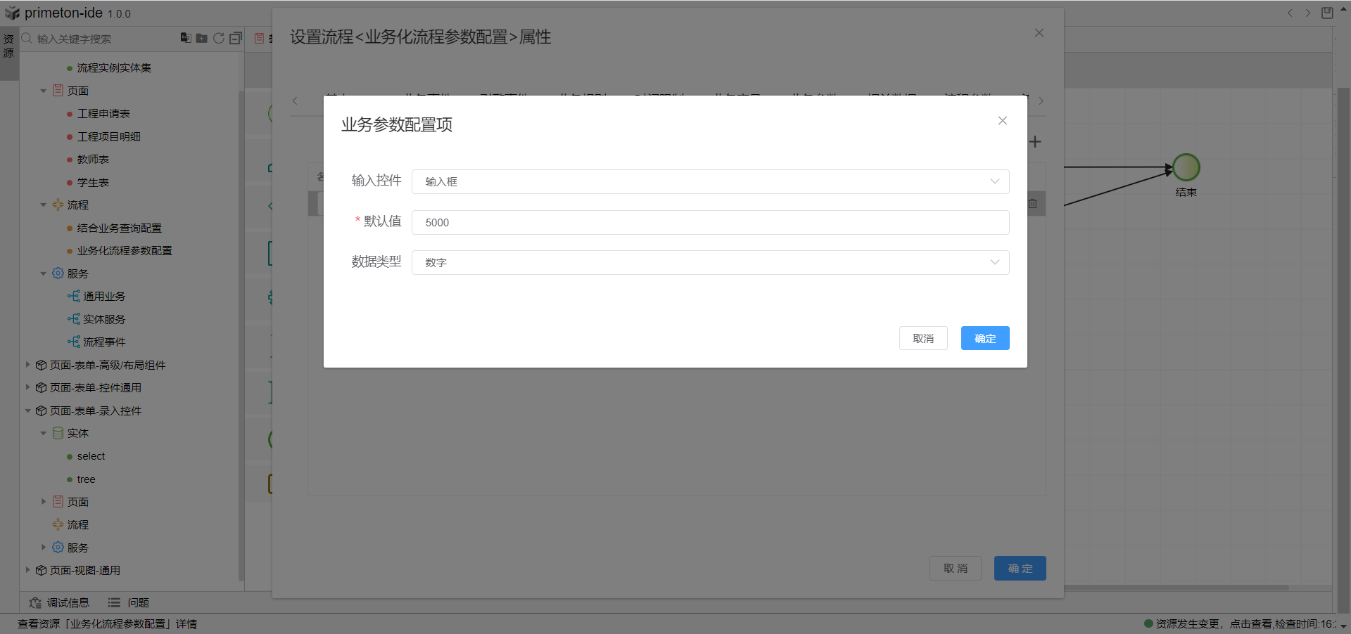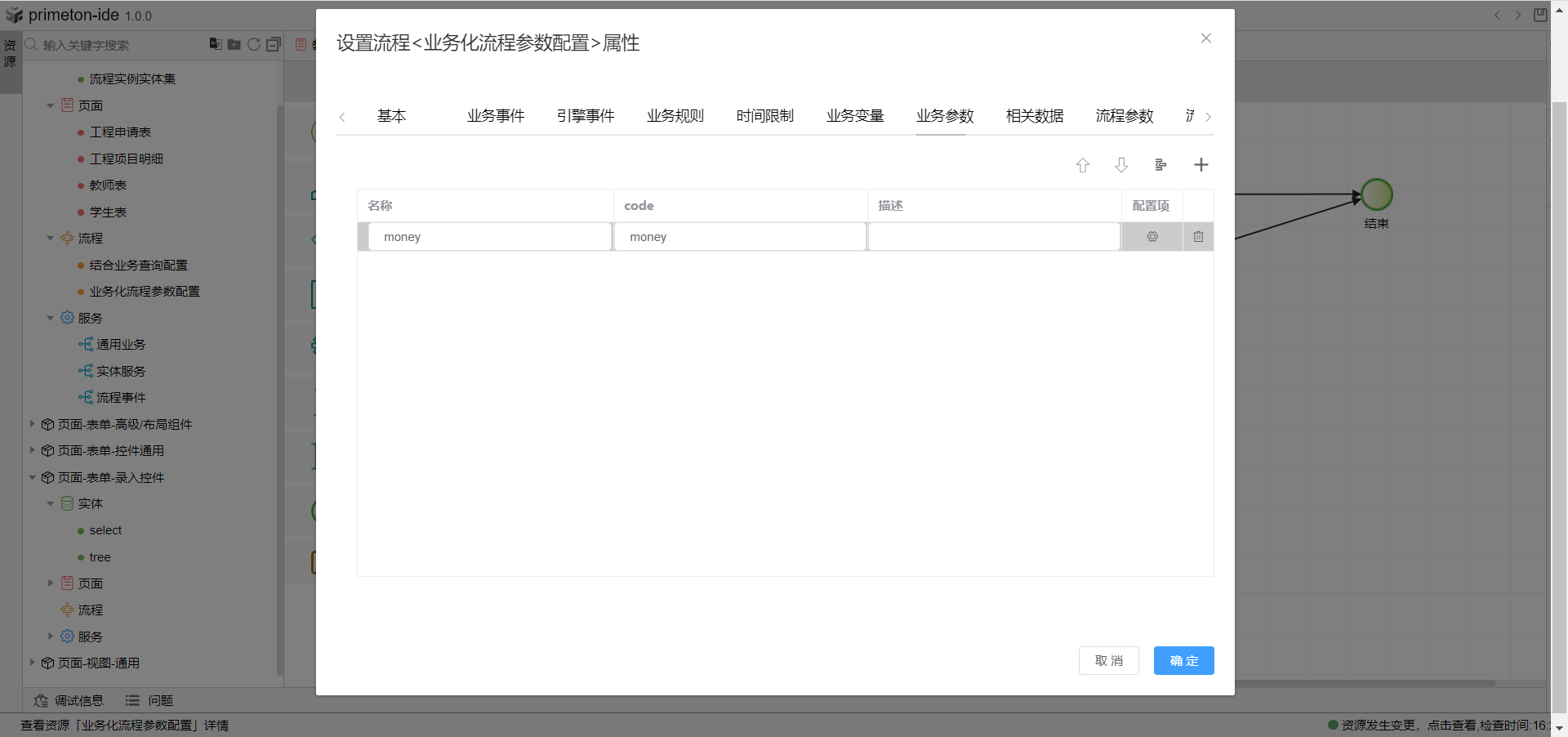 1.创建完流程后双击空白面板,打开属性设置弹窗,选择业务参数tab页,定义一个业务变量,名称与code自定义,点击右侧配置项图标,选择业务参数的输入控件、默认值与数据类型。