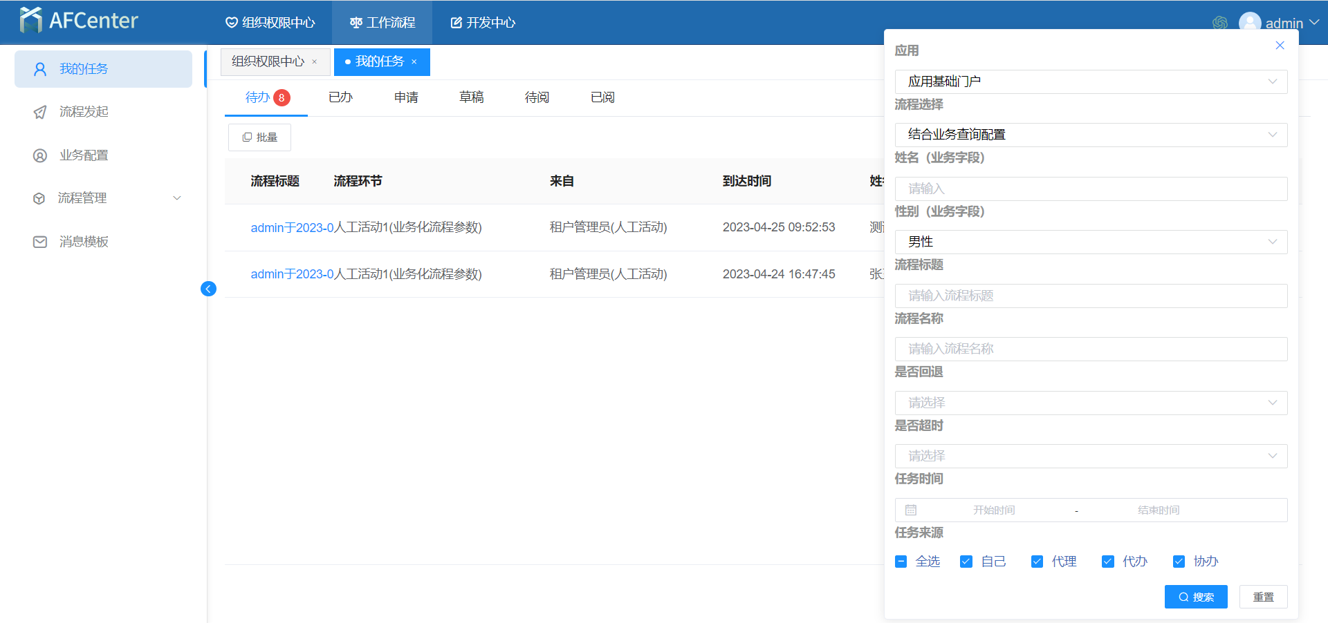 3.打开AFCenter平台工作流程-我的任务页面,在我的待办页面点击高级查询,打开查询条件输入弹框,首先选择流程所在应用,然后选择我们配置好的业务查询的流程,即可看到刚刚的业务查询条件在这里显示出来。然后在业务查询条件中输入查询数据点击查询即可获取对应条件的数据。