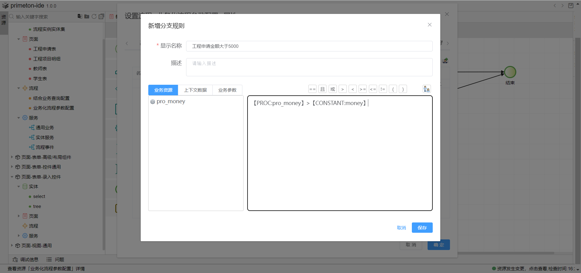 3.选择业务规则tab页,定义一个业务规则,点击右侧编辑图标设置分支规则详细配置,在业务规则文本框内,左侧选择业务变量,右侧选择业务参数,设置规则表达式为流程表单金额填写大于5000时返回true。