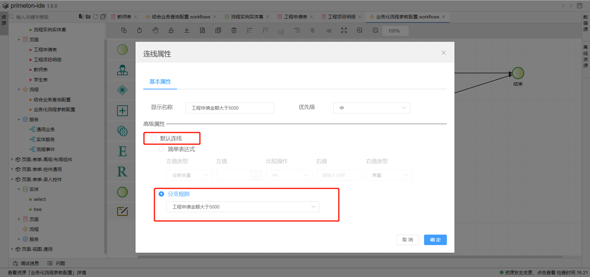 4.双击需要配置分支规则的连线打开连线属性,取消默认连线分支,选择分则规则,配置好刚刚创建分支规则。即可完成业务化流程参数配置操作,当表单中填写金额大于5000,走向一级部门主管审批页面,小于等于5000走向上级主管审批环节。