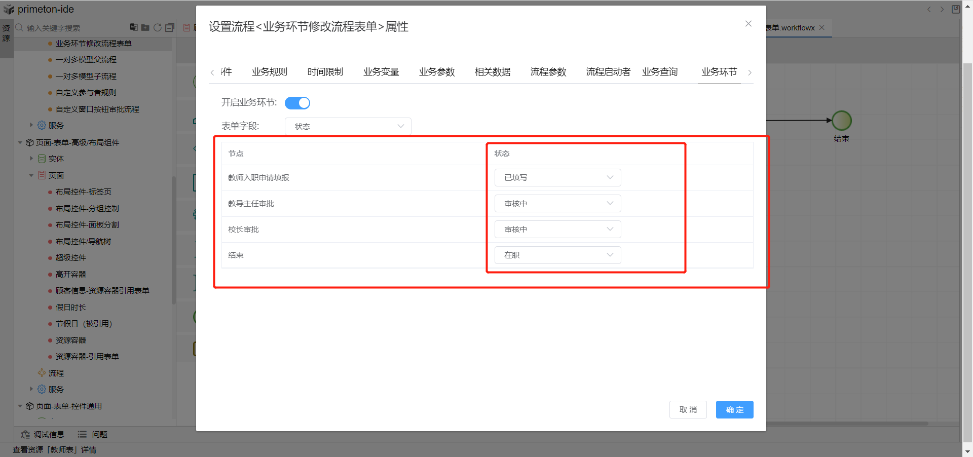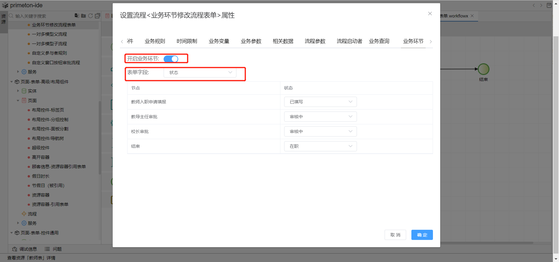 2.根据创建的表单创建一条教师信息审核流程,双击空白面板切换到业务环节tab页,开启业务环节开关, 选择表单字段为教师状态字段。