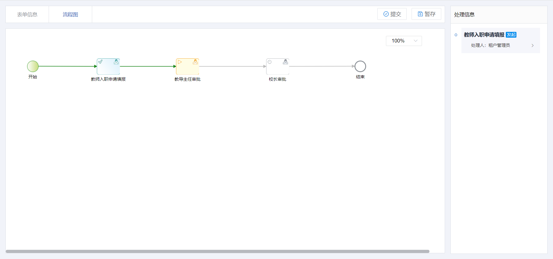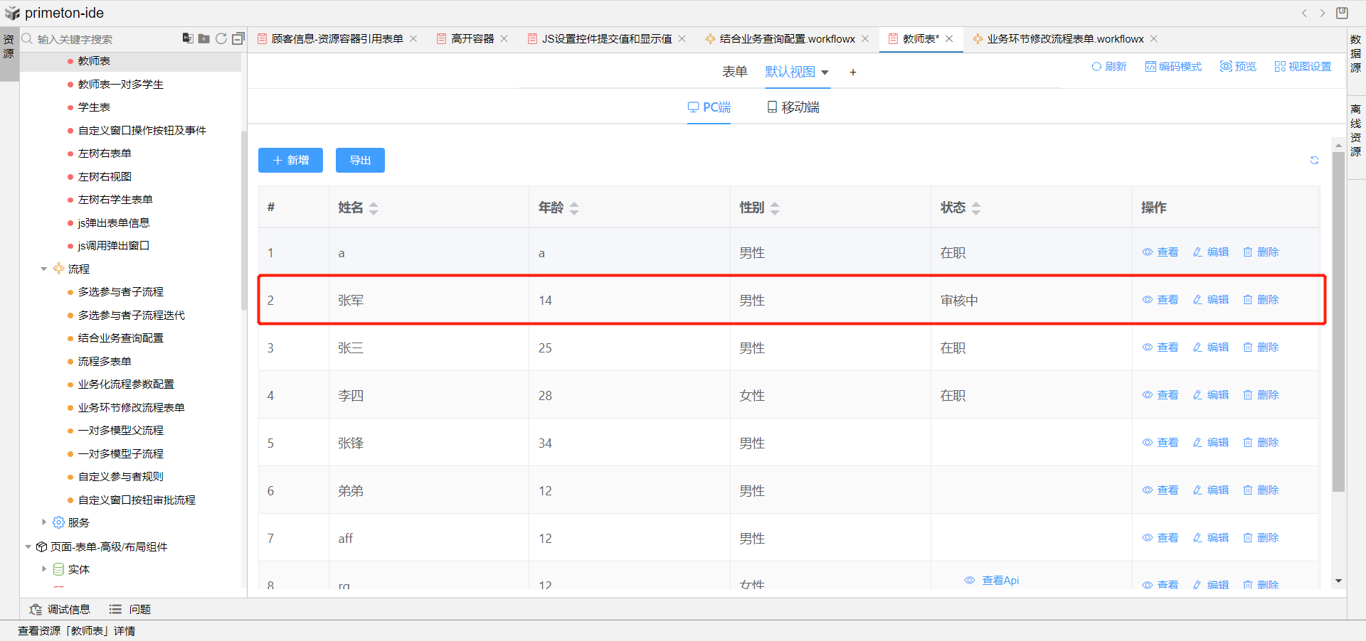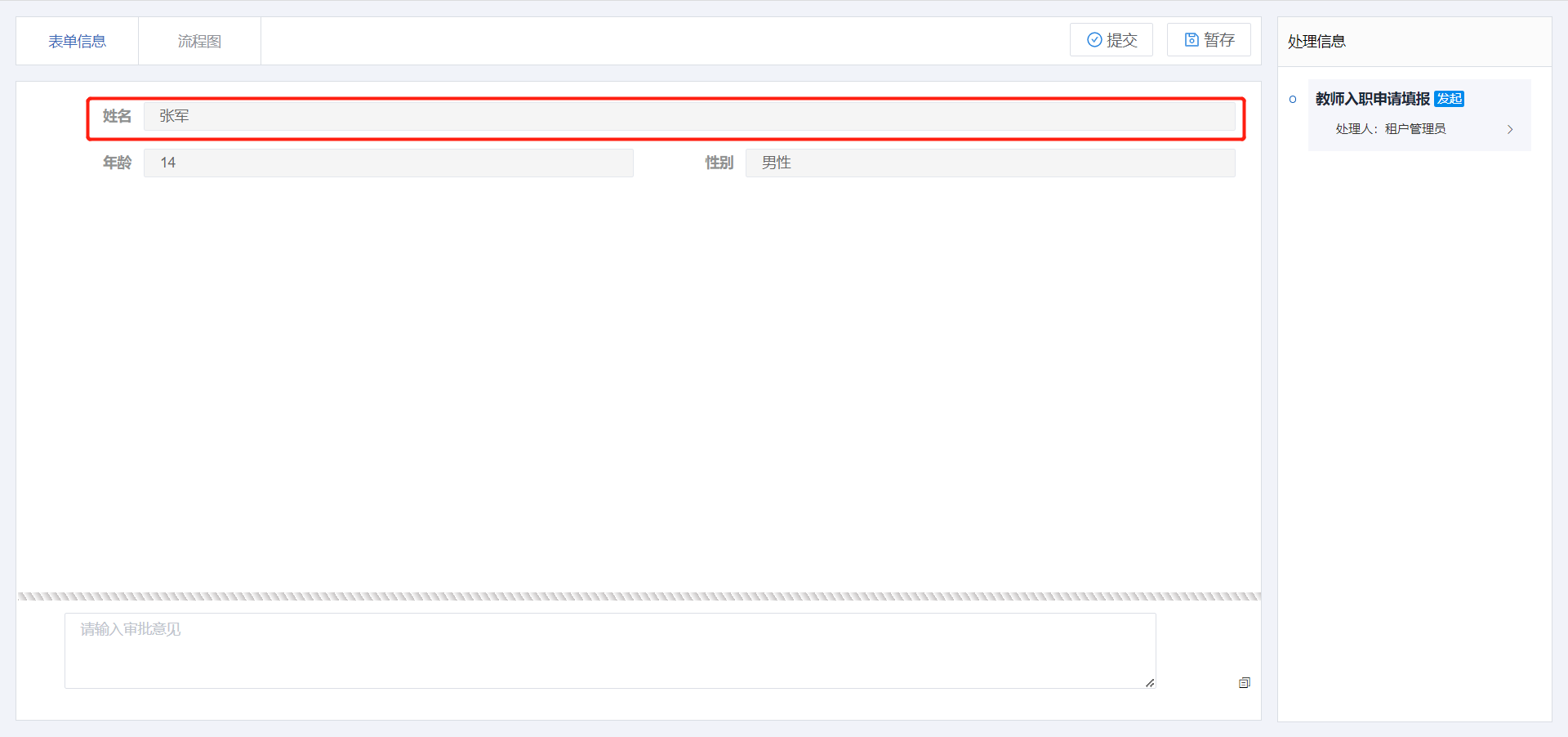 使用场景:教师发起入职信息填写申请表单,提交后自动触发逻辑流修改申请表状态为申请中,管理员审批同意提交后,自动触发逻辑流修改申请表状态为在职。