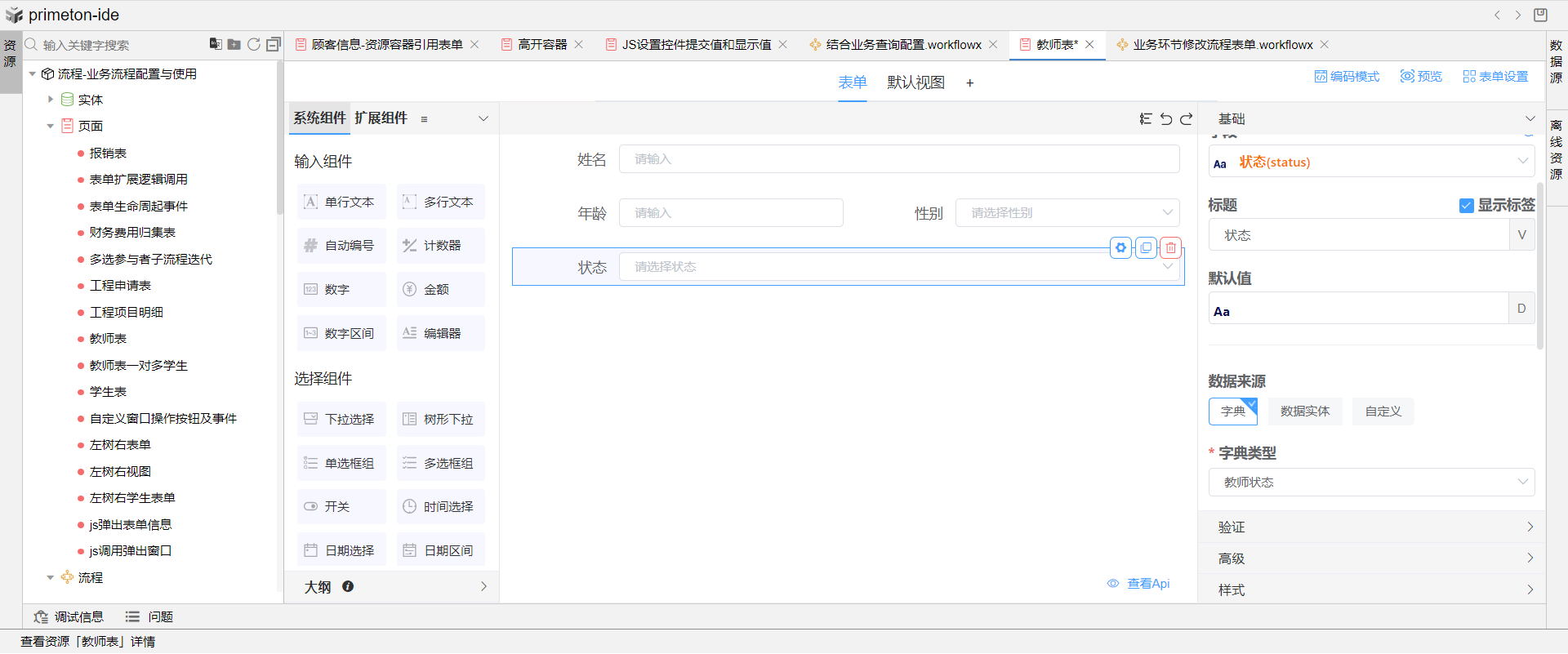 1.创建教师信息表单后,拖选一个下拉控件绑定教师状态字段,并给下拉组件绑定业务字典。
