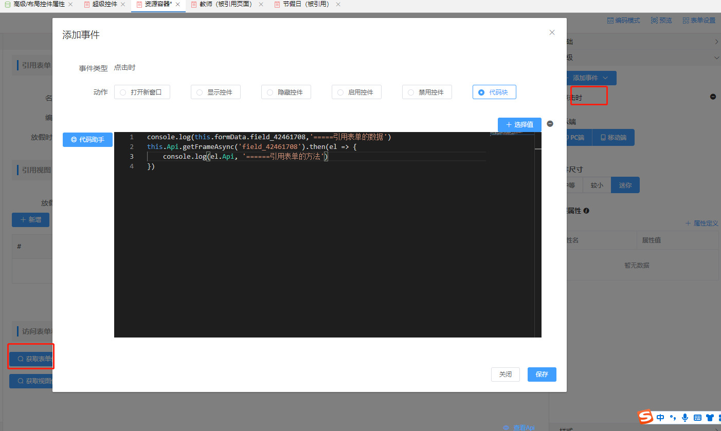 当标签页切换时也需要去查询视图数据,所以在标签页组件的高级中创建切换标签事件,当标签页切换时执行不同视图的查询事件。