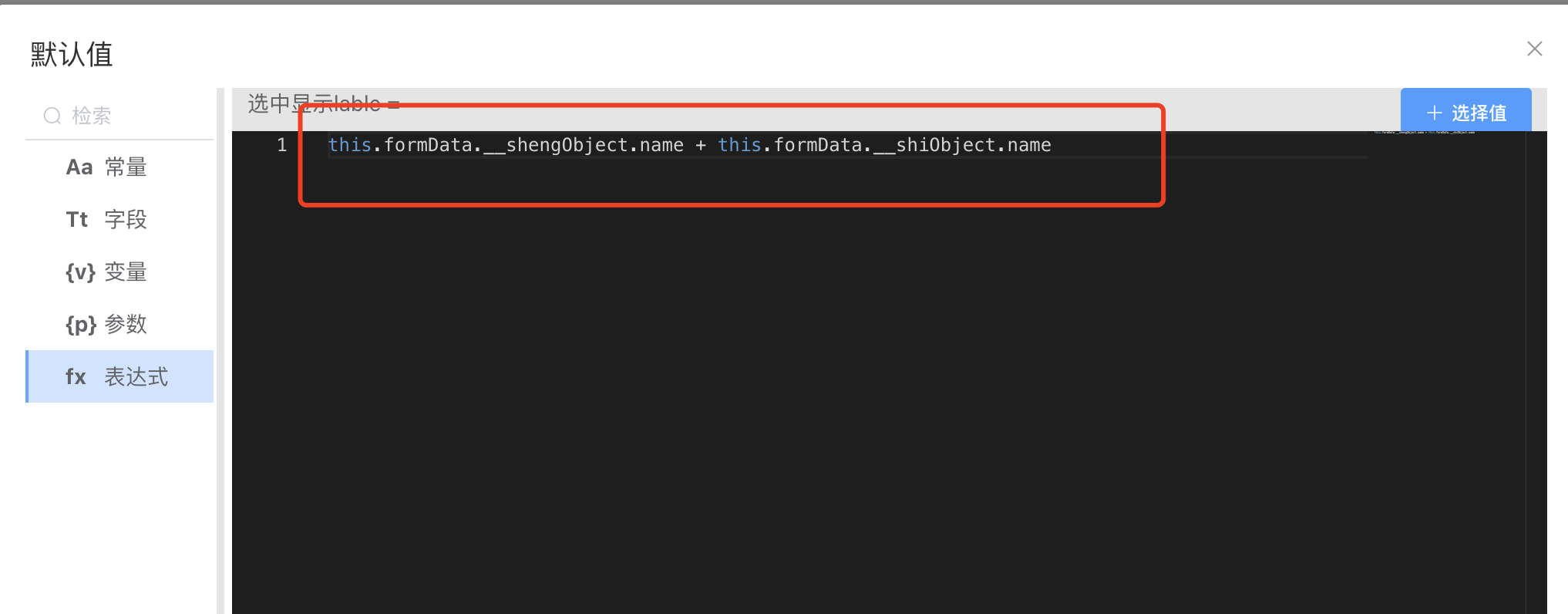 同时在当前表单生成一个系统对象__productNameObject,可为单价和单位组件设置默认值,该默认值就为这个系统对象中的单价和单位字段值。