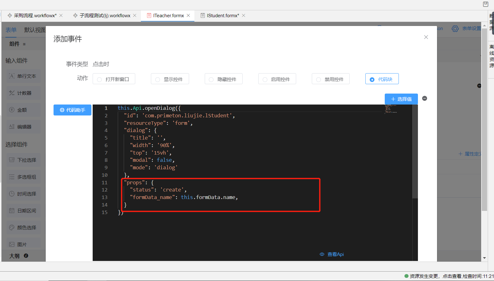 例如在Iteacher的表单中放入绑定IStudent的子表格组件,在IStudent的视图中就可通过this.parentFormData拿到作为父表单的ITeacher表单中formData的数据。如下图所示,在子表格行操作按钮中写下触发事件在控制台打印this.parentFormData参数,即可看到ITeacher的formData数据展示在控制台中。