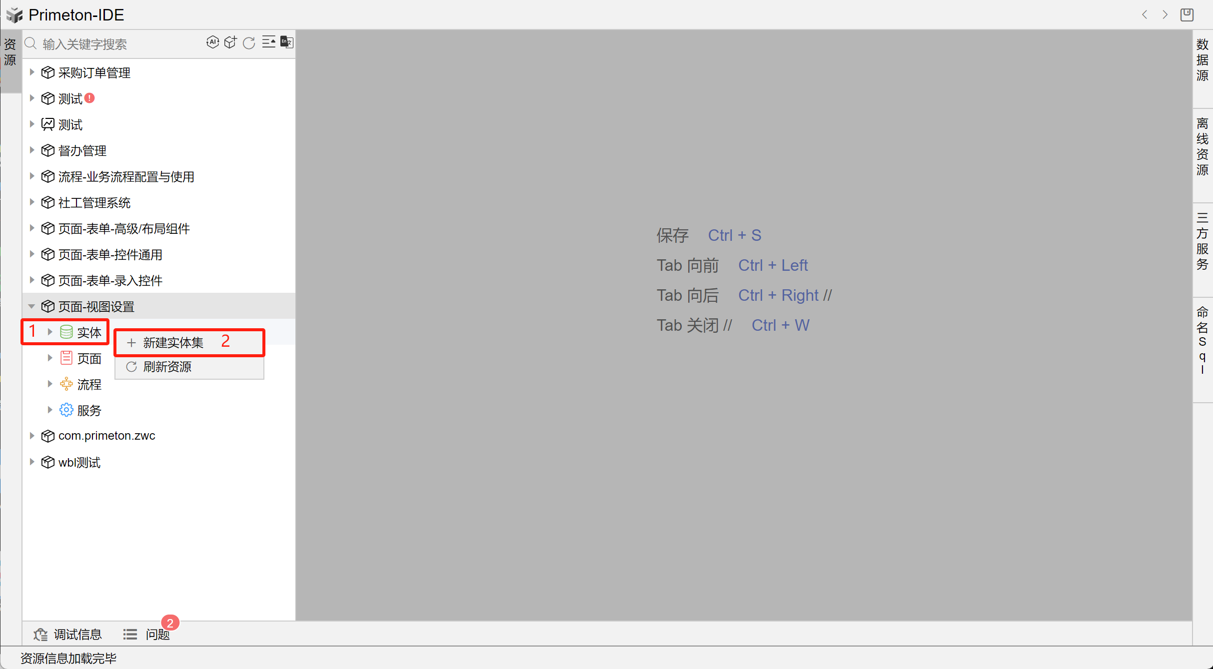 1 选择构件包的实体资源,右键,在下拉菜单中选择新建实体集。
