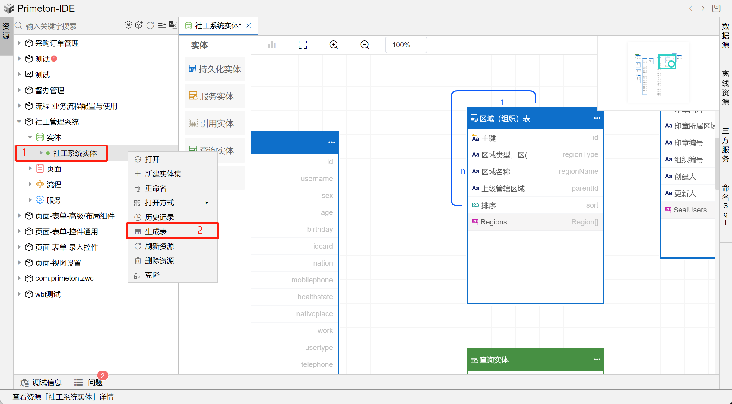 操作:右键点击需要生成表的实体,选择菜单中的生成表。