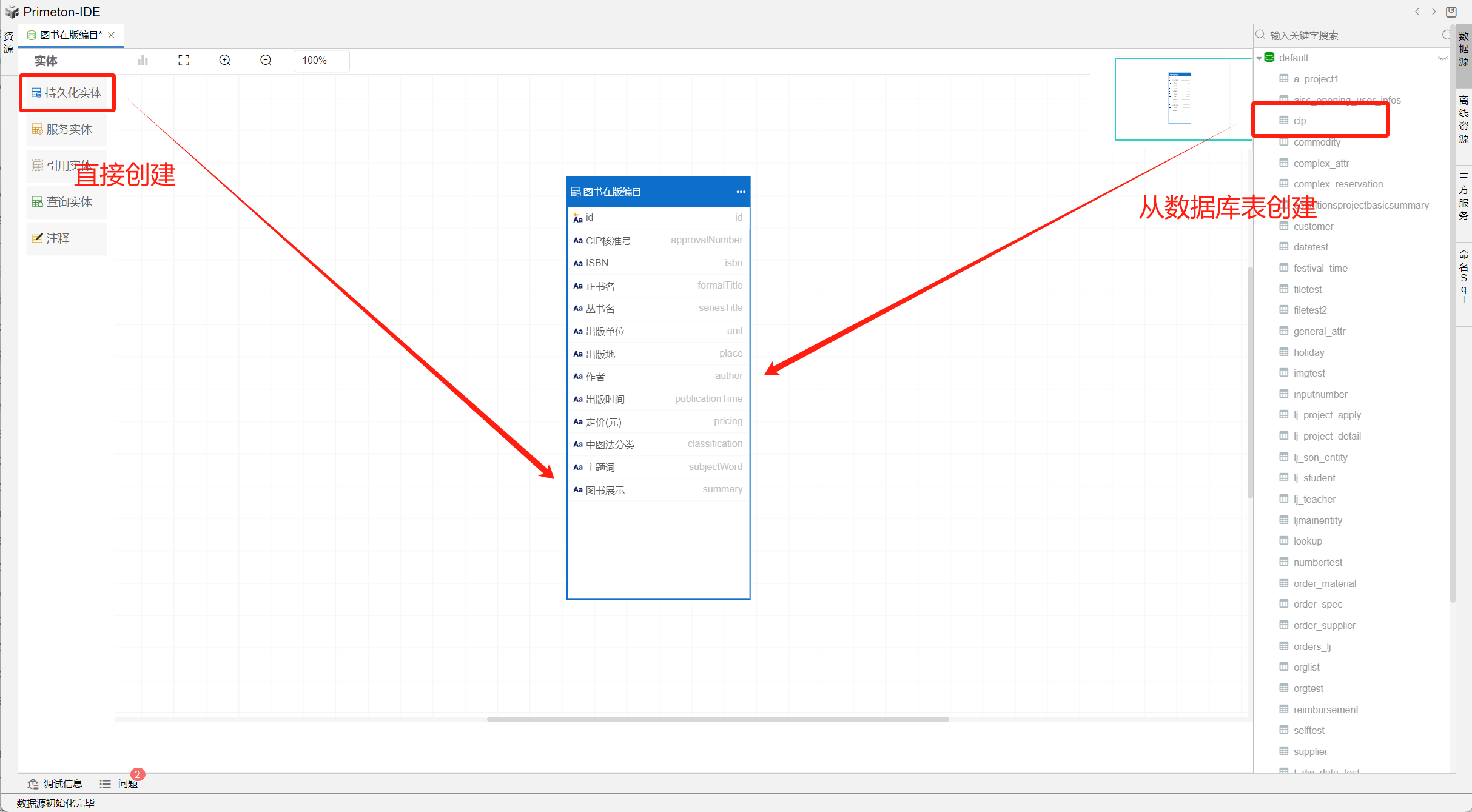 打开实体编辑界面,从数据源中拖入表可以生成持久化实体。通过这种方式,用户可以快速地从数据库中获取现有表,并自动根据其结构创建实体。