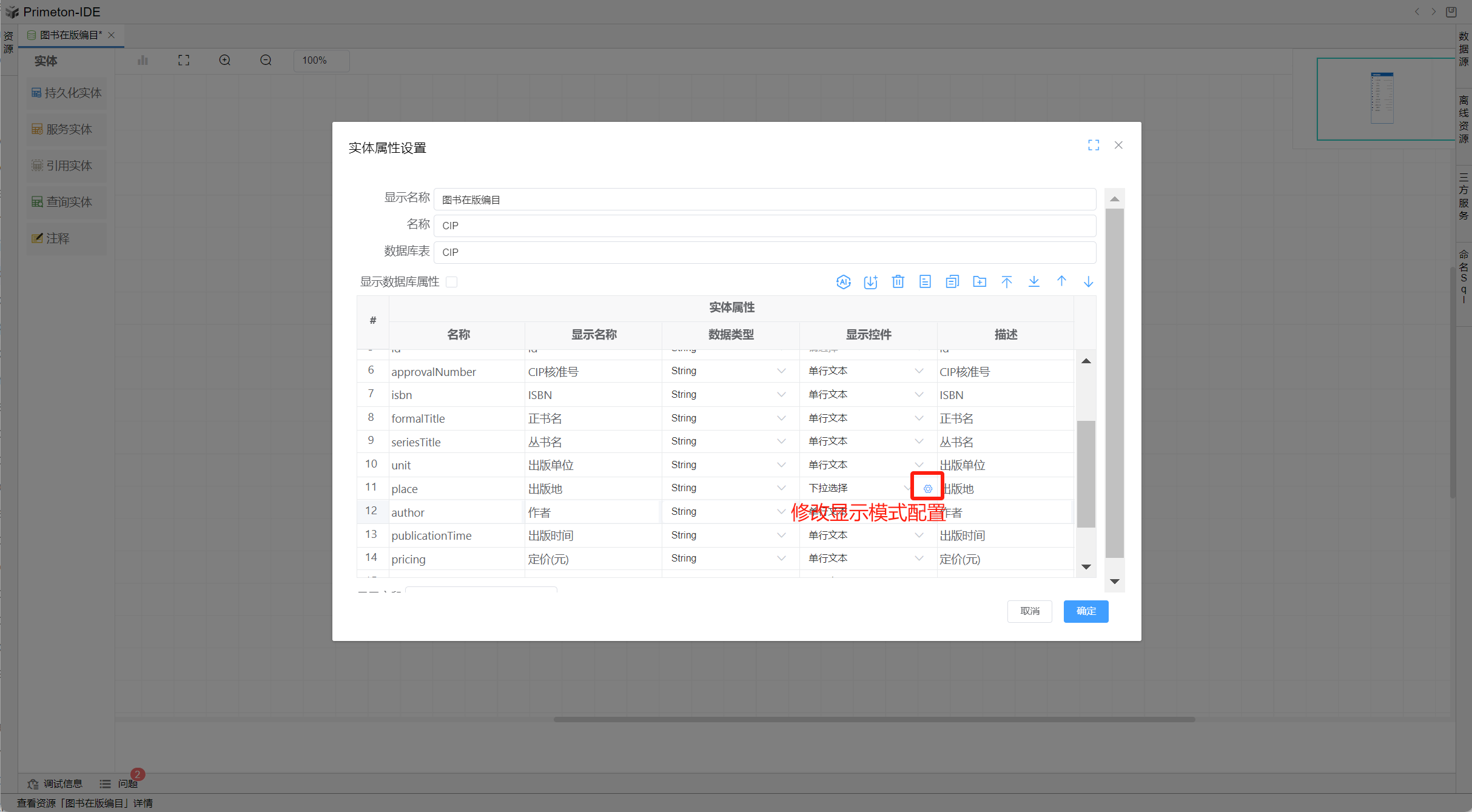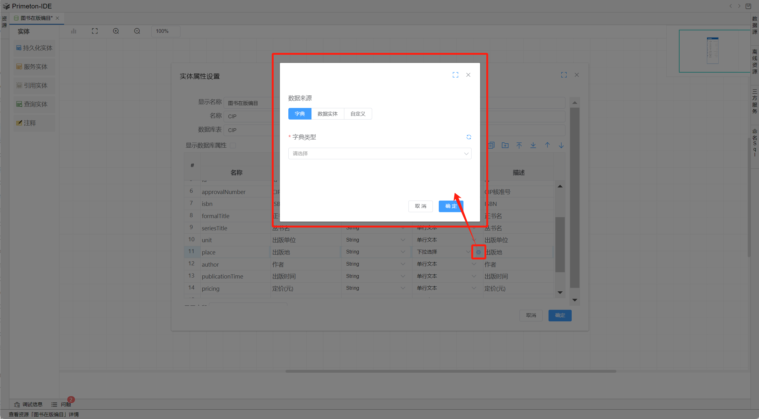 打开创建实体的实体集。用户可以从实体面板中拖拽所需的持久化实体到画布上,并配置持久化实体的属性。