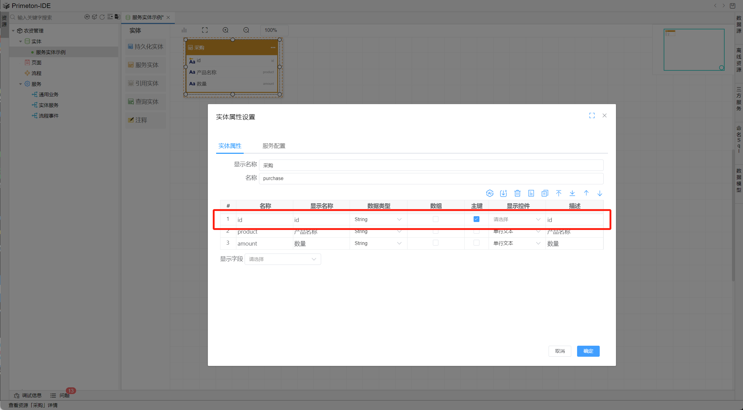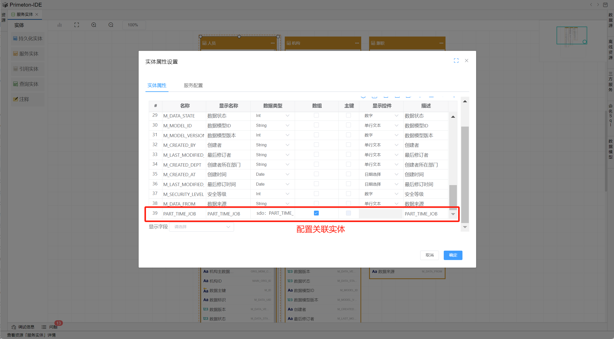 选中要创建的实体集,打开实体编辑界面,从实体框中拖拽服务实体到画布上。双击服务实体,可以对实体进行配置,以及对实体进行修改显示名称、修改名称、添加基本属性、上移下移、删除属性的操作。单击属性列可以修改对应的属性配置。