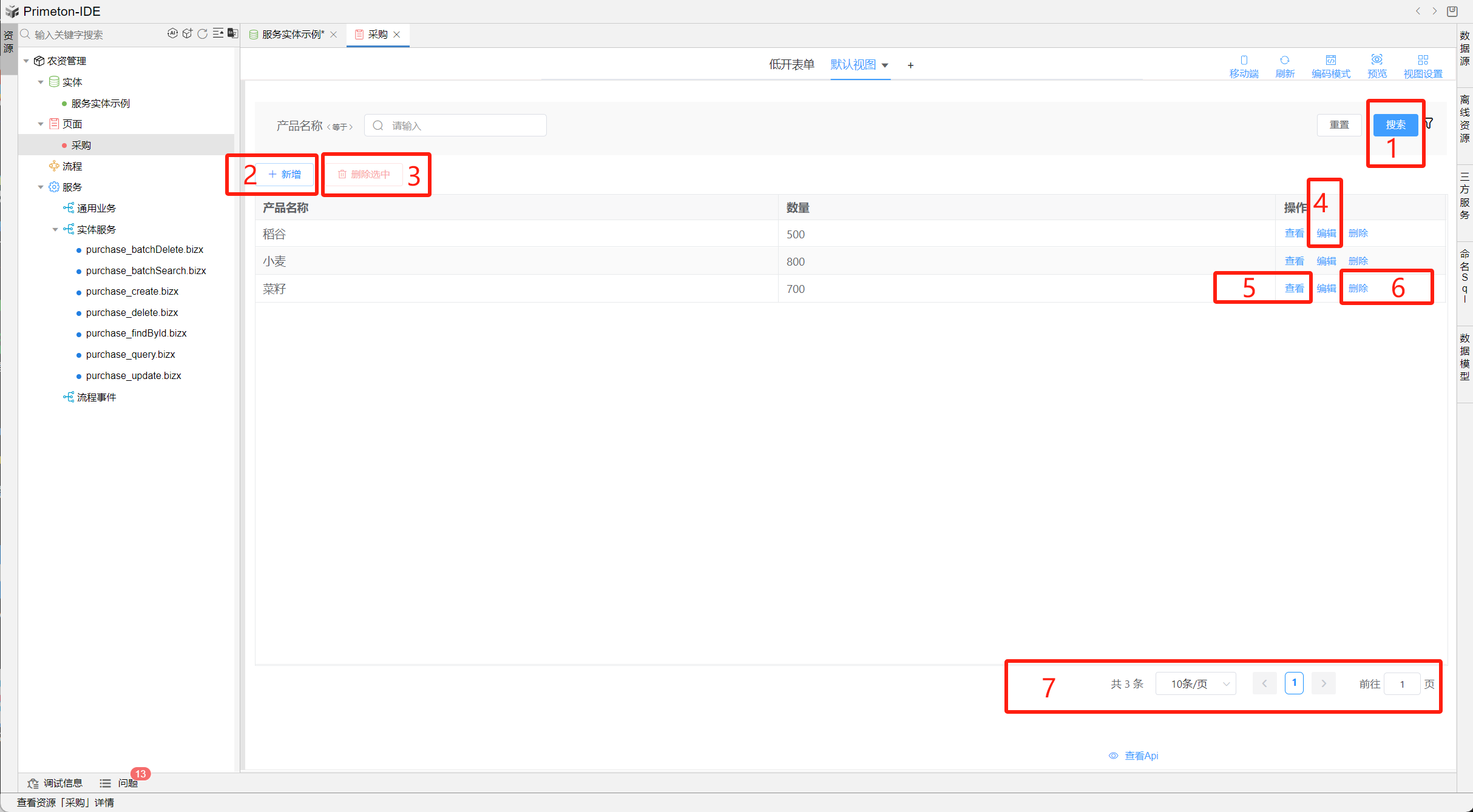 分页查询实体服务用于服务实体绑定的分页查询目标服务,实现服务实体的分页查询。主要有六个参数,分别是datasourceName、entityName、condition、cascadeDeep、pageIndex、pageSize。返回值数据类型是PageResultList<DataObject>。在视图层面,该服务主要用于分页查询数据(如图一中的7所示)。