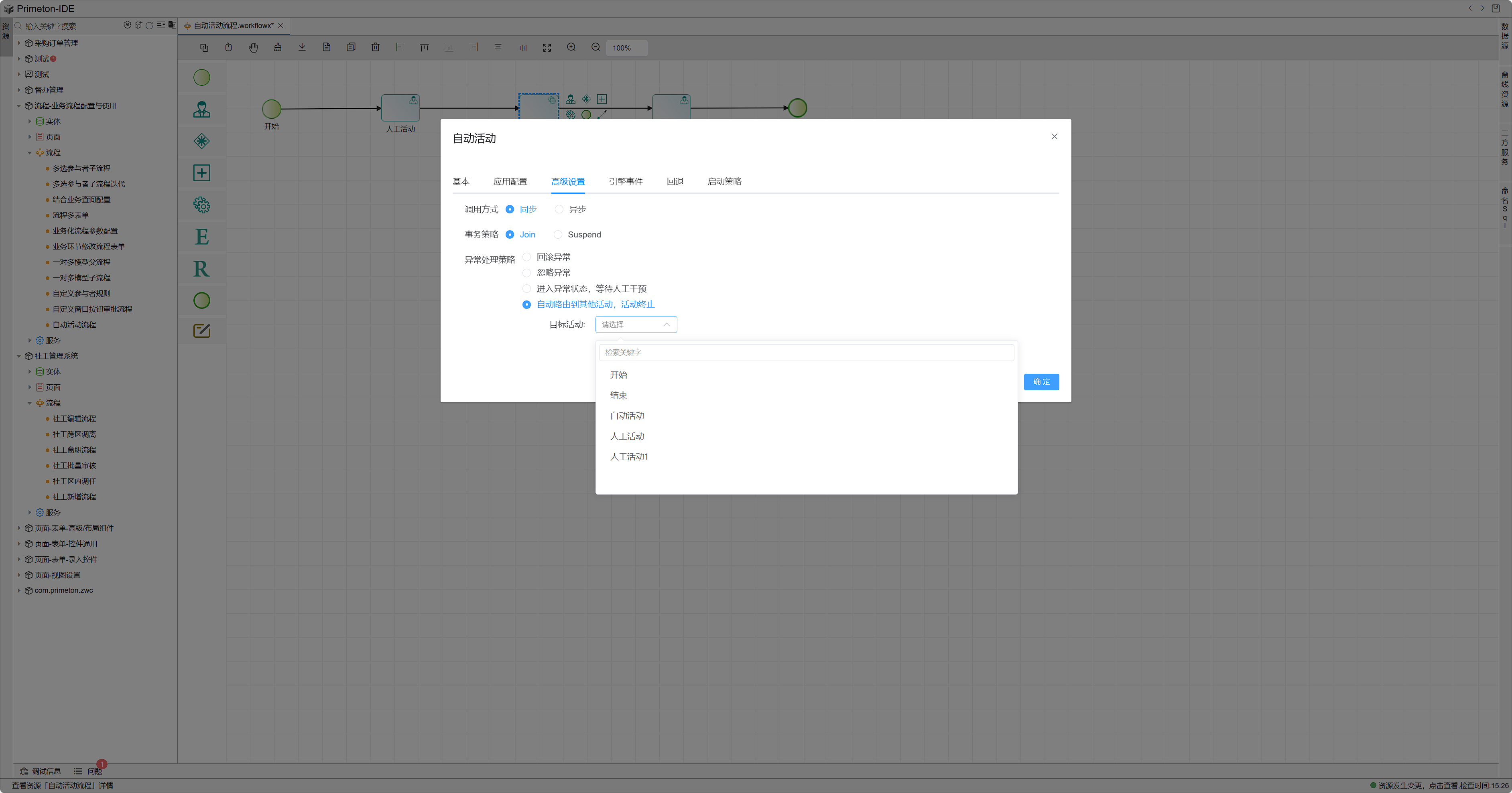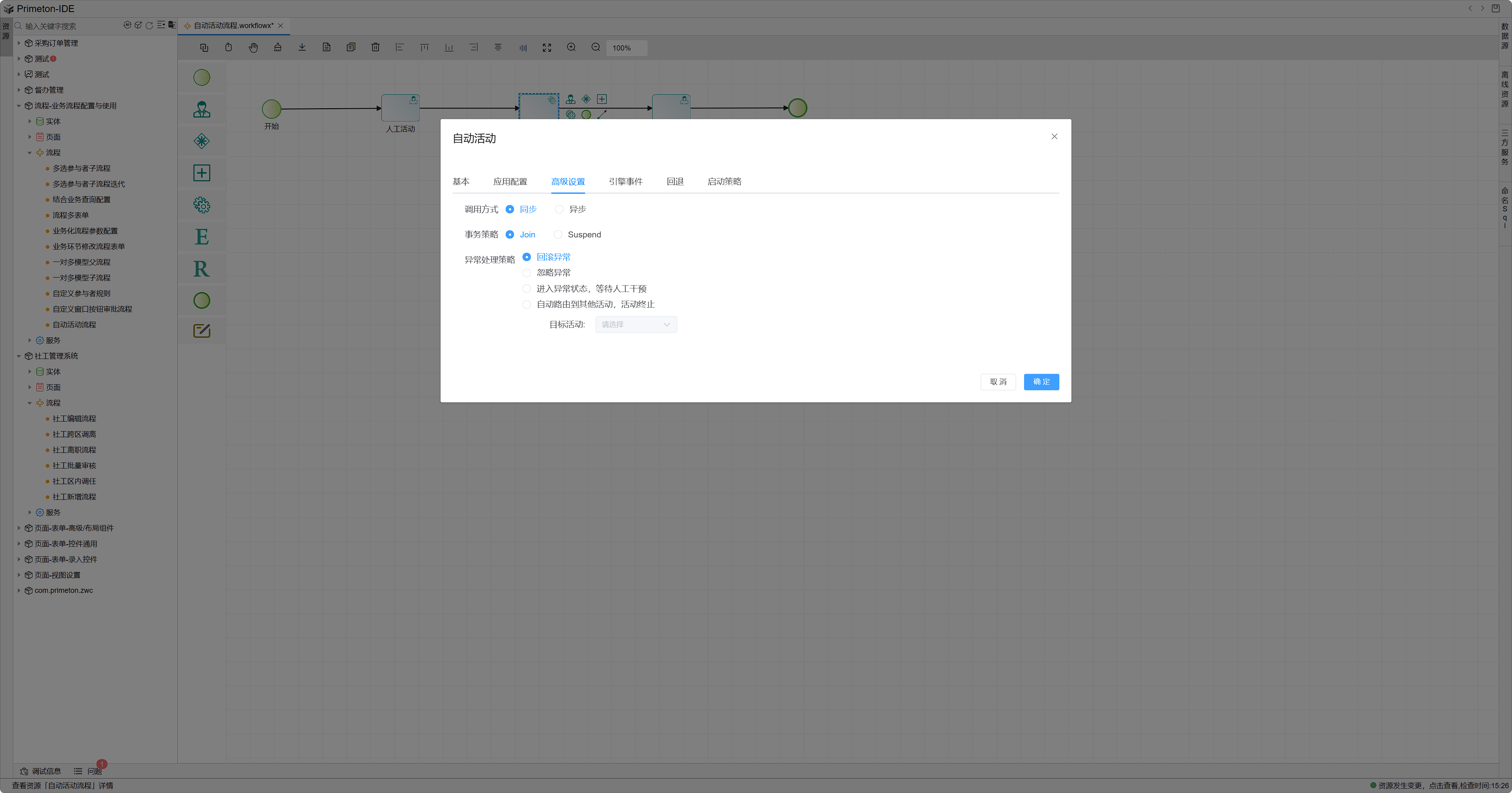 自动活动在执行过程中很有可能会出错,我们提供了多种异常处理机制,如:异常回滚、忽略异常、进入异常状态,等待人工干预和自动路由到其他活动,活动终止。
