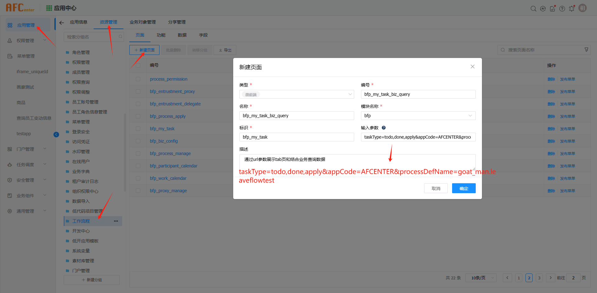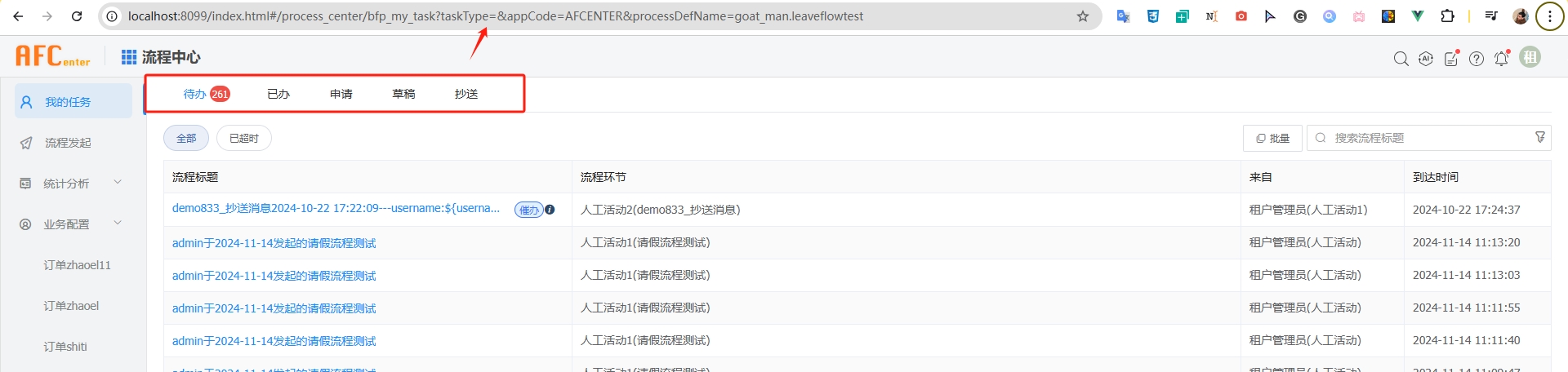 http://localhost:8099/index.html#/process_center/bfp_my_task?taskType=todo,done,apply&appCode=AFCENTER&processDefName=goat_man.leaveflowtest参数说明
