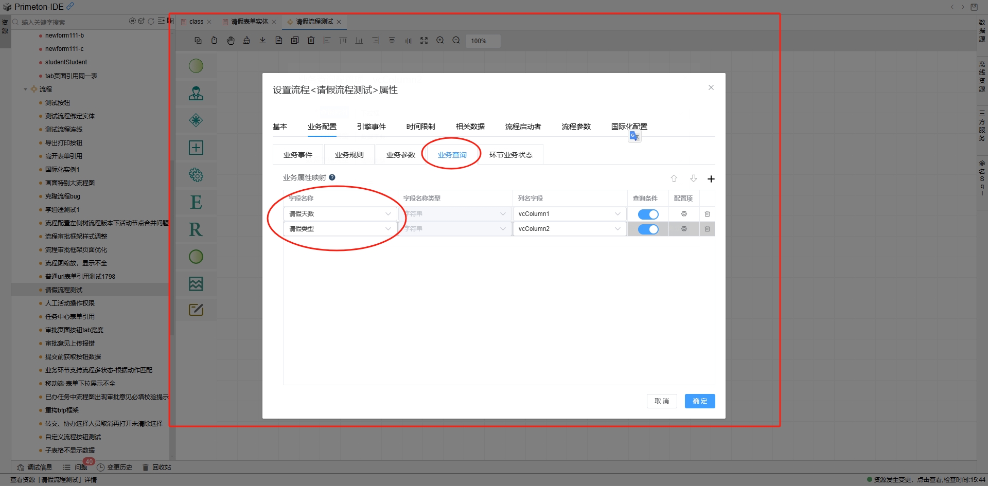创建流程并且绑定上步创建的表单,设置业务查询。