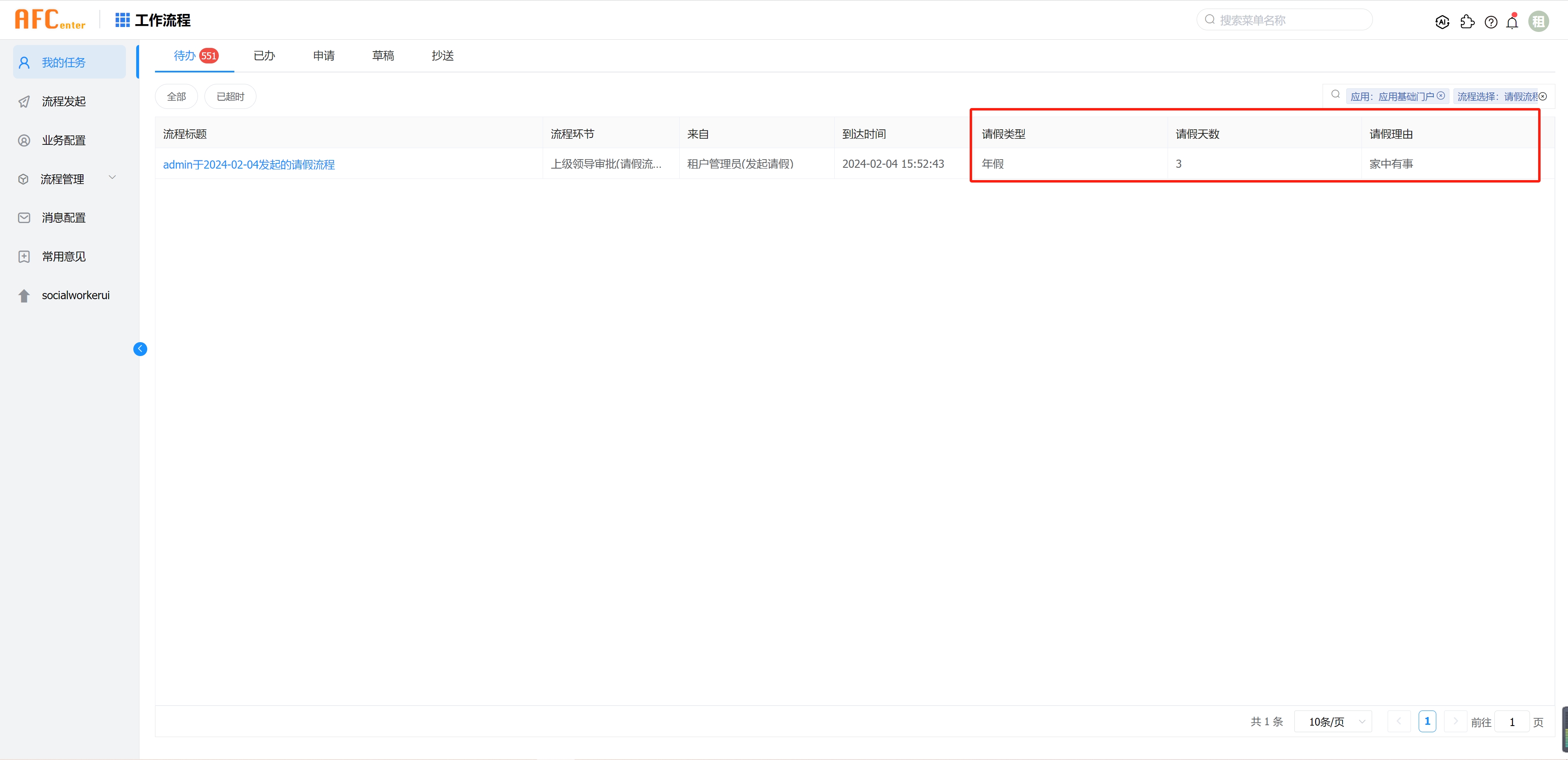 任务中心列表查询选择对应应用下的“请假流程”,即可出现配置的属性列作为查询结果或查询条件。 如下图以待办任务列表为例,已办、申请同理。