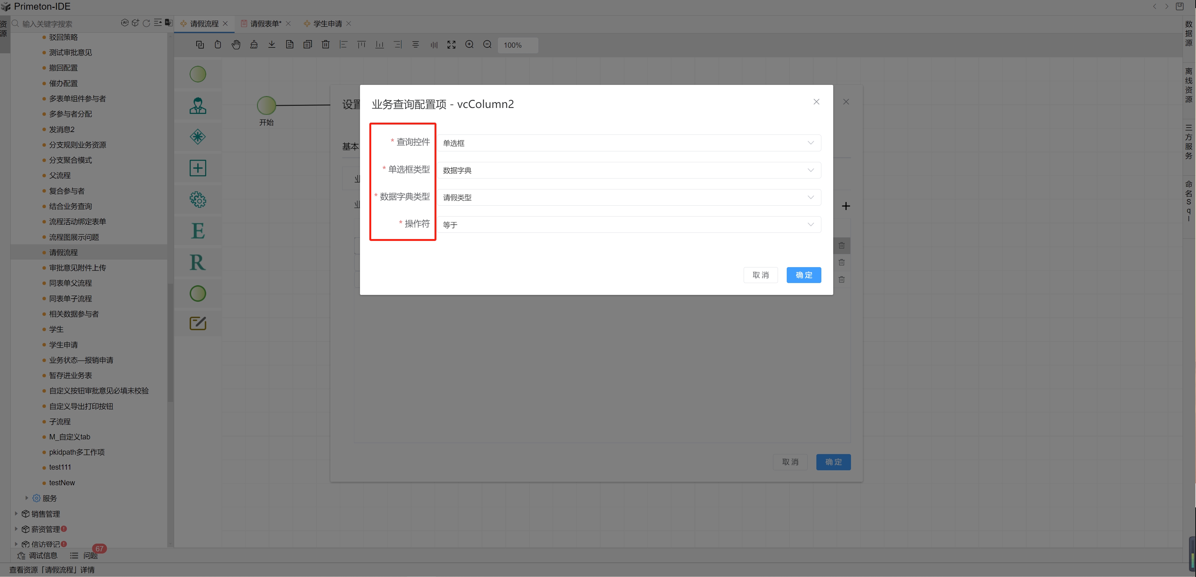 当“请假类型”设置成为查询条件时,即可配置查询条件。
