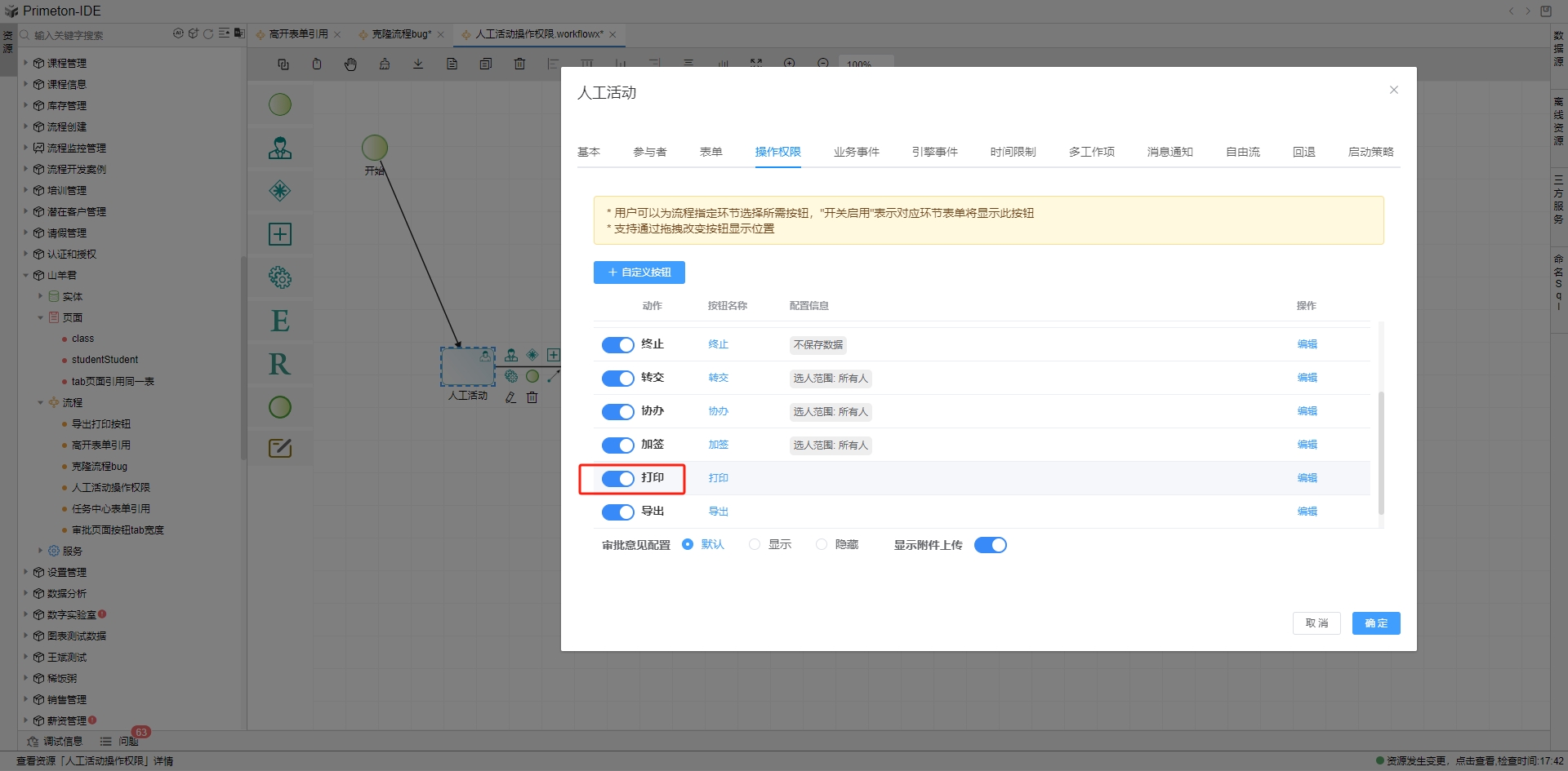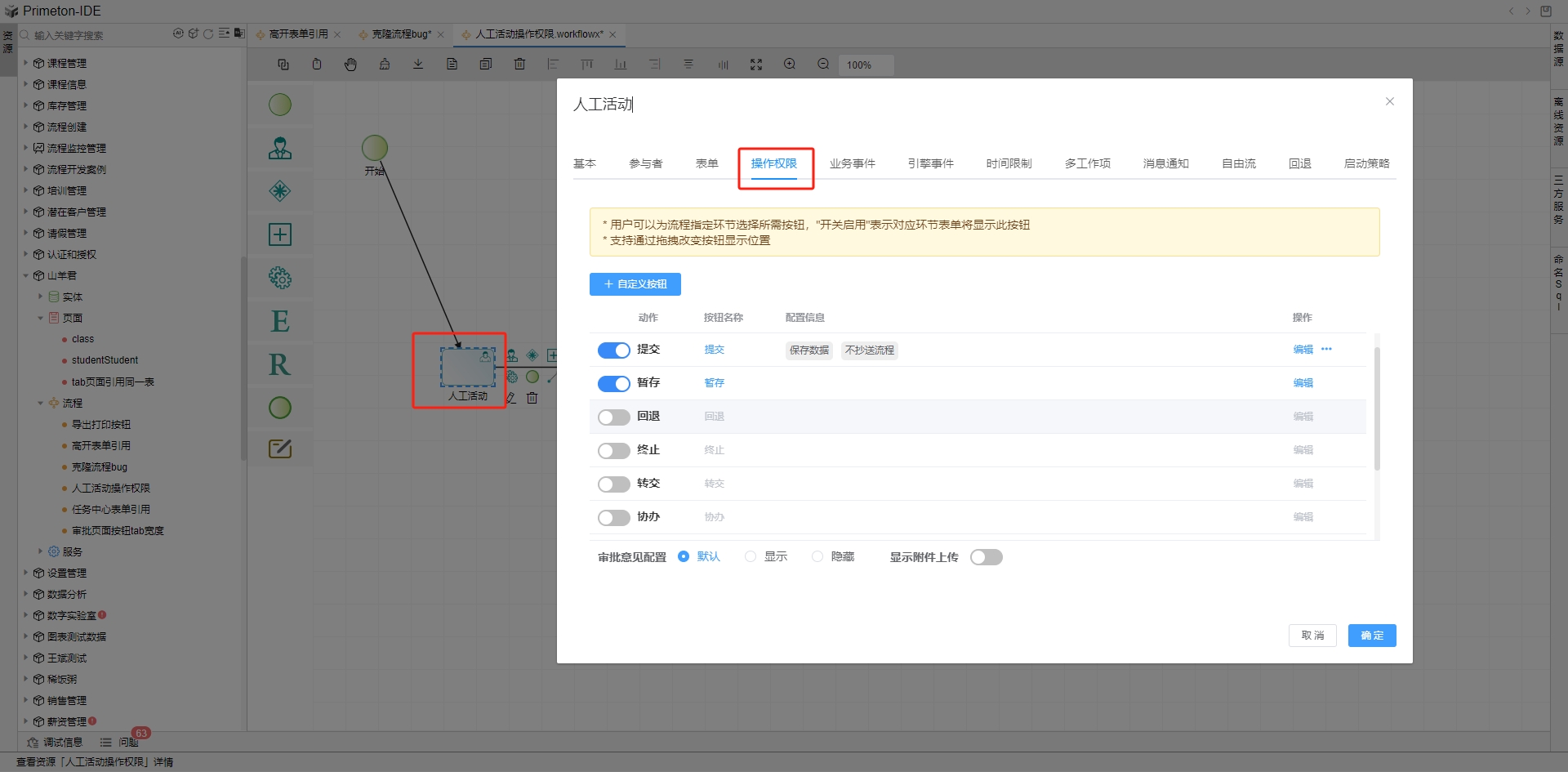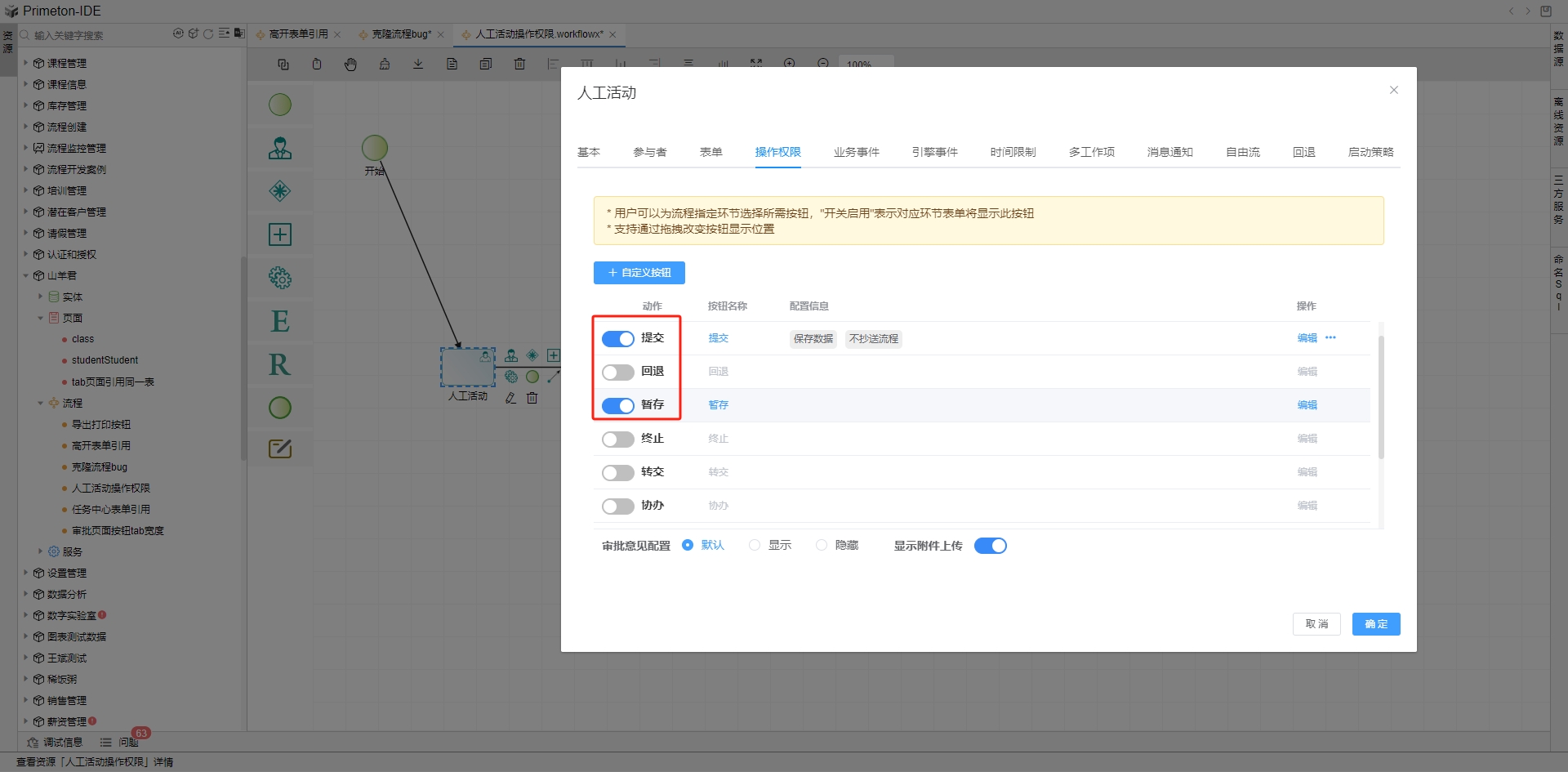 流程在运行过程中会有各种操作,如提交、暂存,回退、终止、转交、协办、加签、打印、导出等。根据每个活动图元特定的业务需求来设置操作权限。列表内展示默认配置的操作按钮,其中提交和暂存是默认开启的按钮,回退、终止、转交、协办、加签、打印、导出等按钮默认不开启。