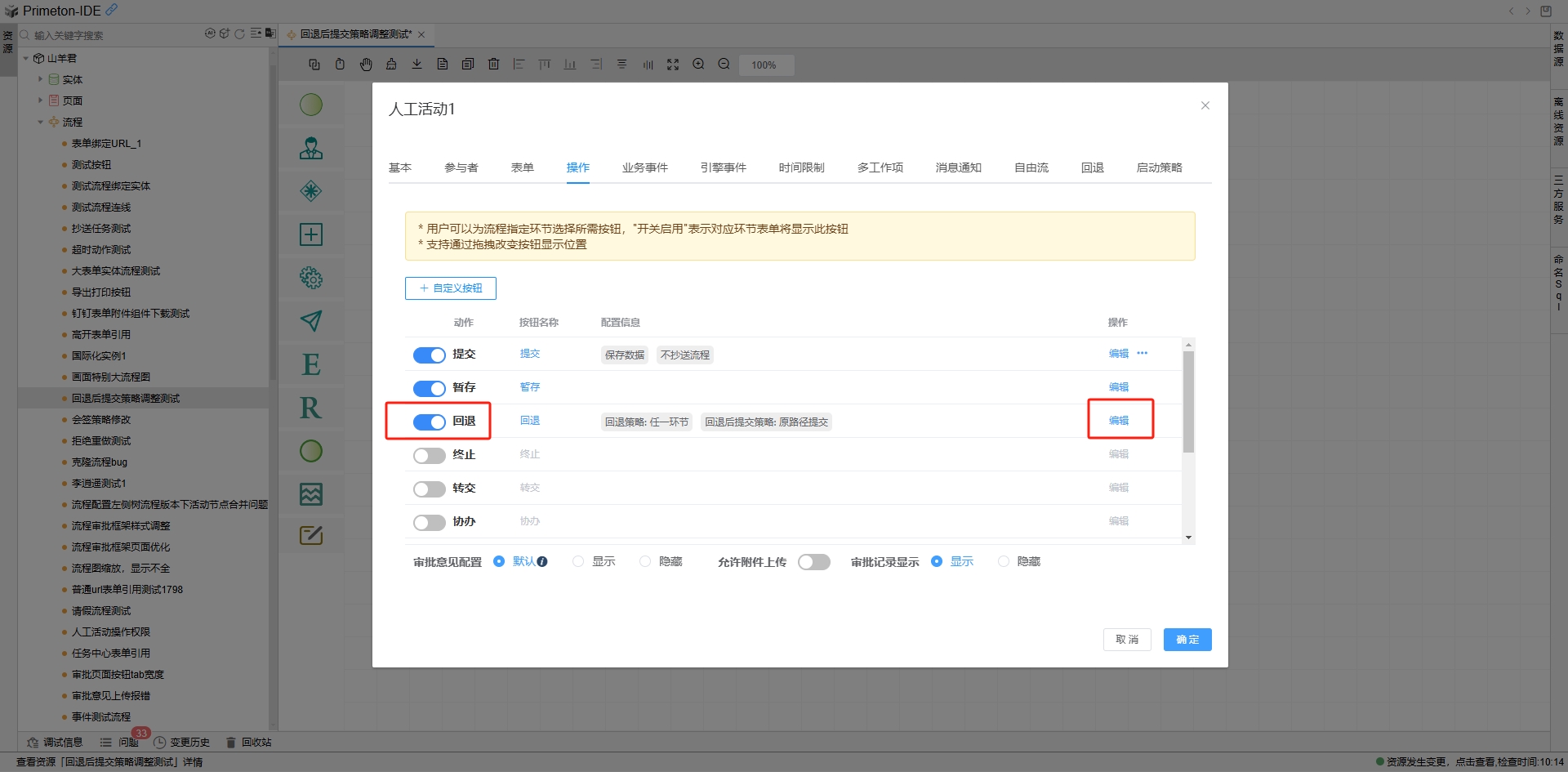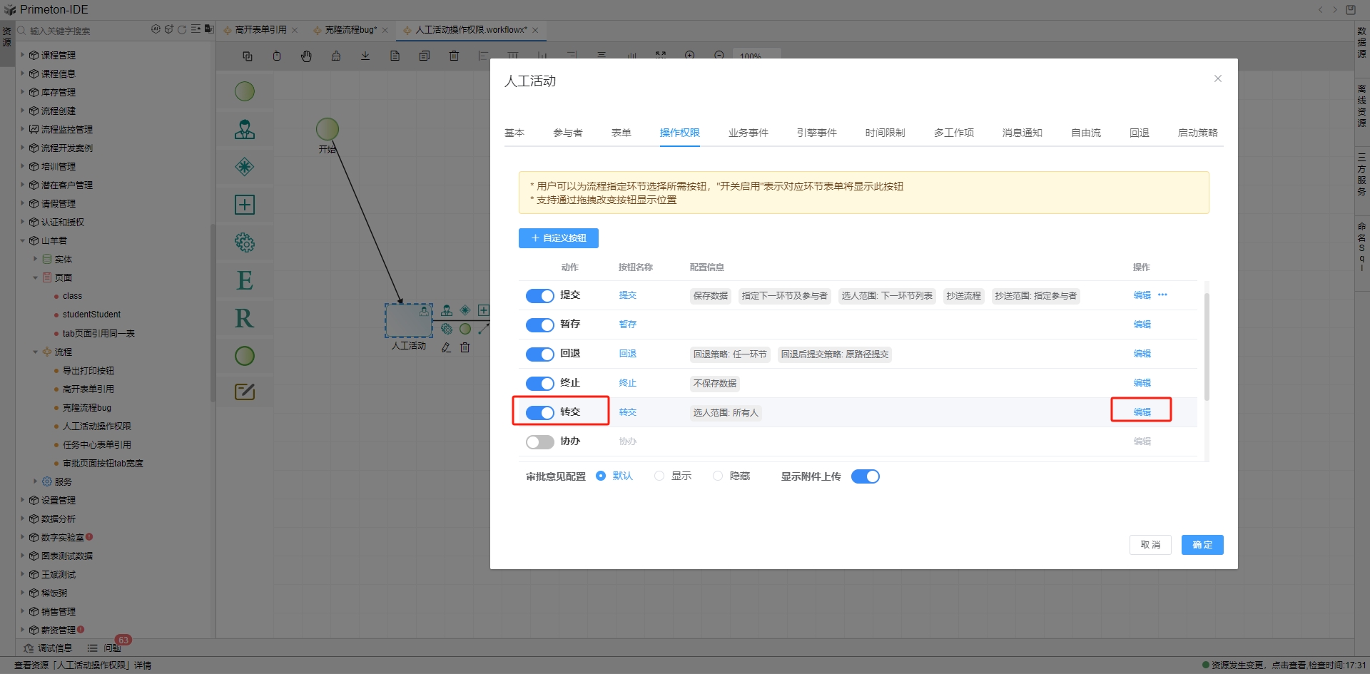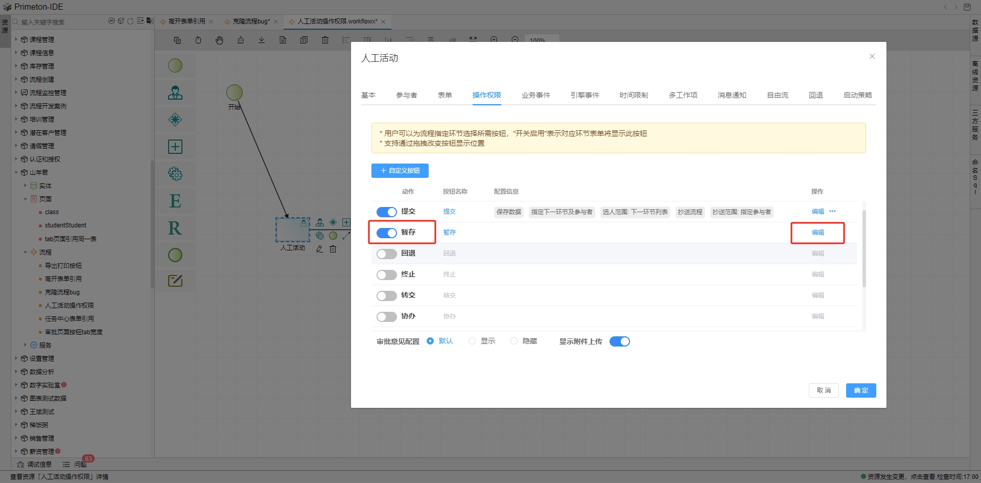 流程在运行过程中会有各种操作,如提交、暂存,回退、终止、转交、协办、加签、打印、导出等。根据每个活动图元特定的业务需求来设置操作权限。列表内展示默认配置的操作按钮,其中提交和暂存是默认开启的按钮,回退、终止、转交、协办、加签、打印、导出等按钮默认不开启。