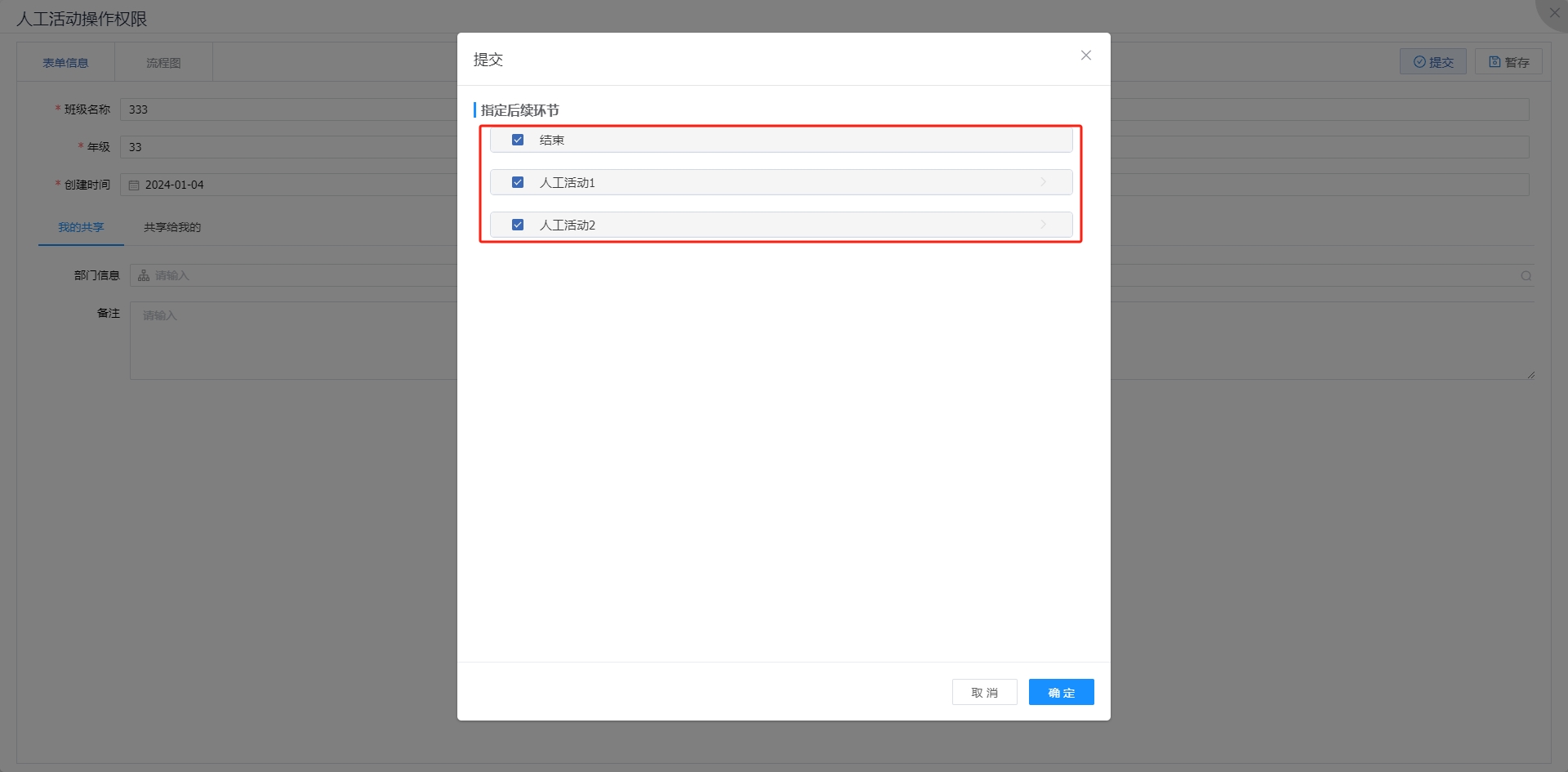 开启并添加后续环节范围后,在当前环节提交时,可以选择提交到后续指定环节中。