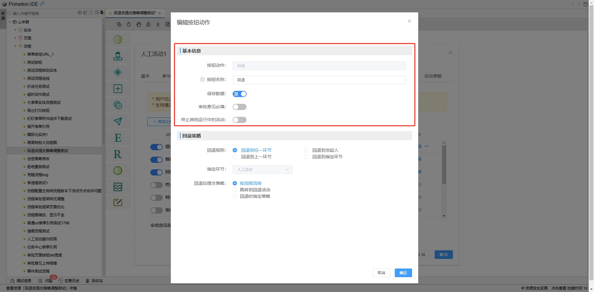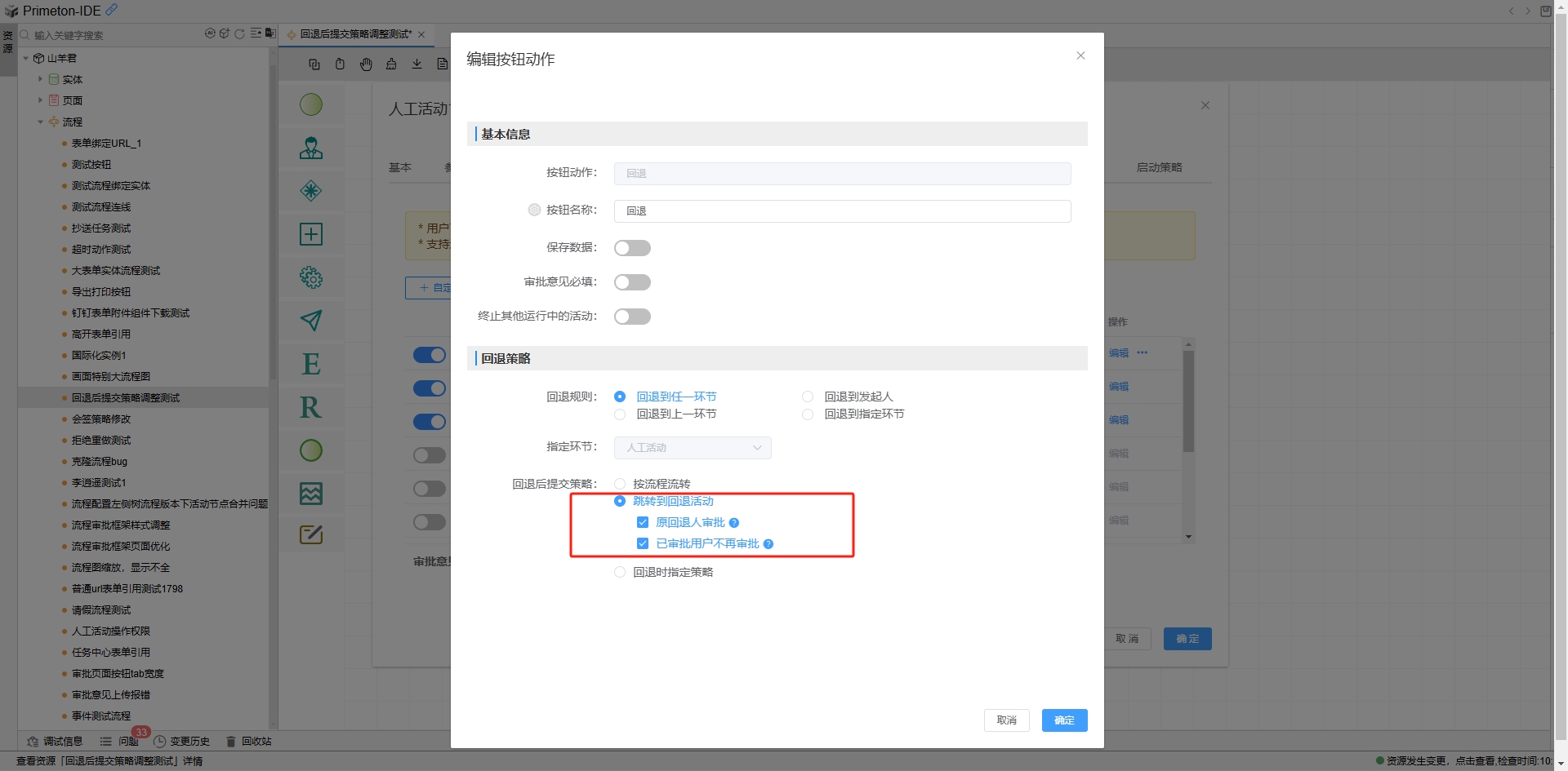 - 回退时指定策略,即将指定策略的时机延迟至运行期(流程审批页面点击回退按钮时),可选项为按流程流转。如下图示。
