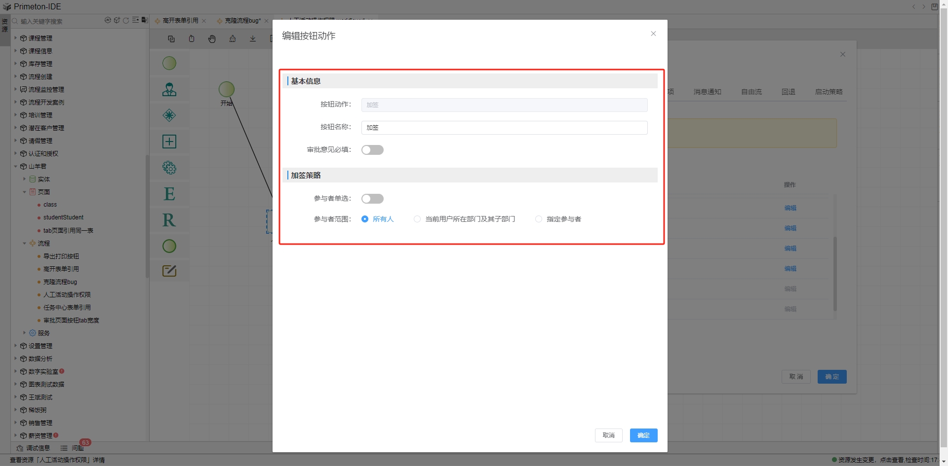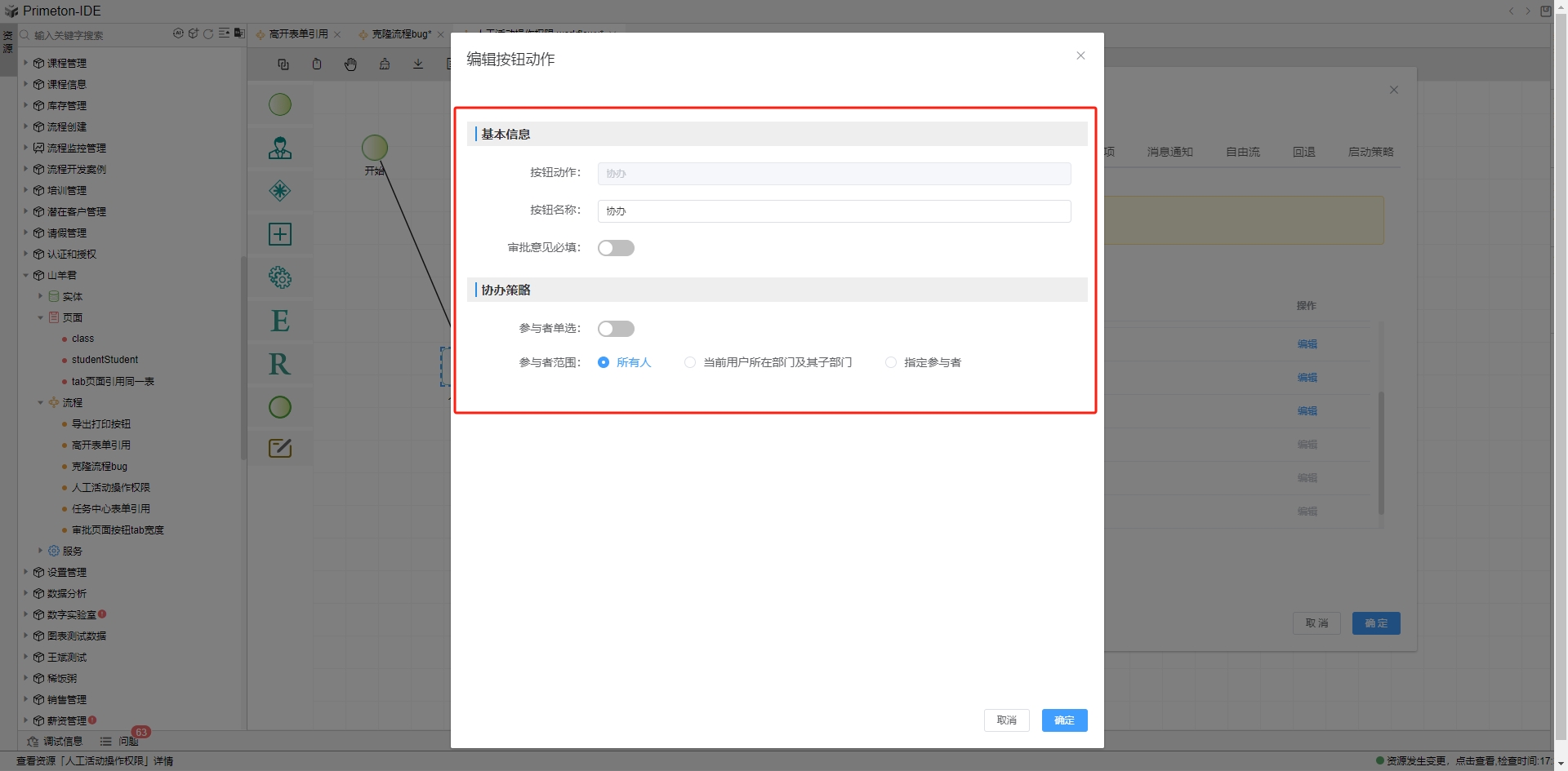 协办为当前流程审批环节中,需要选择特定的人员进行协助审批。点击列表中协办行的编辑按钮,打开协办动作配置弹框。