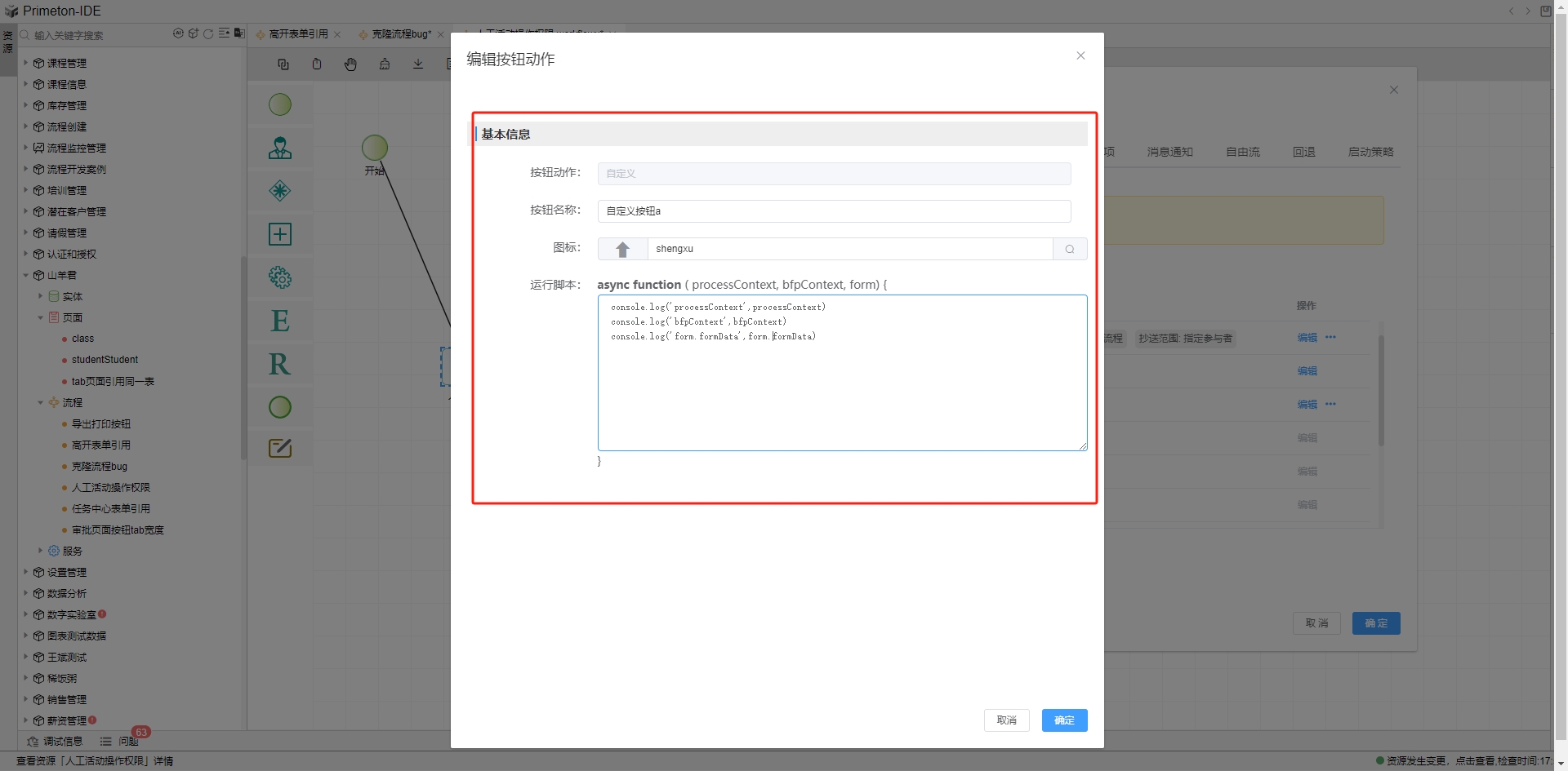 在流程审批环节点击添加的自定义按钮,在控制台可以看到添加的脚本打印输入。