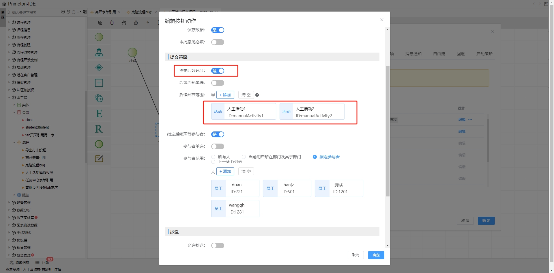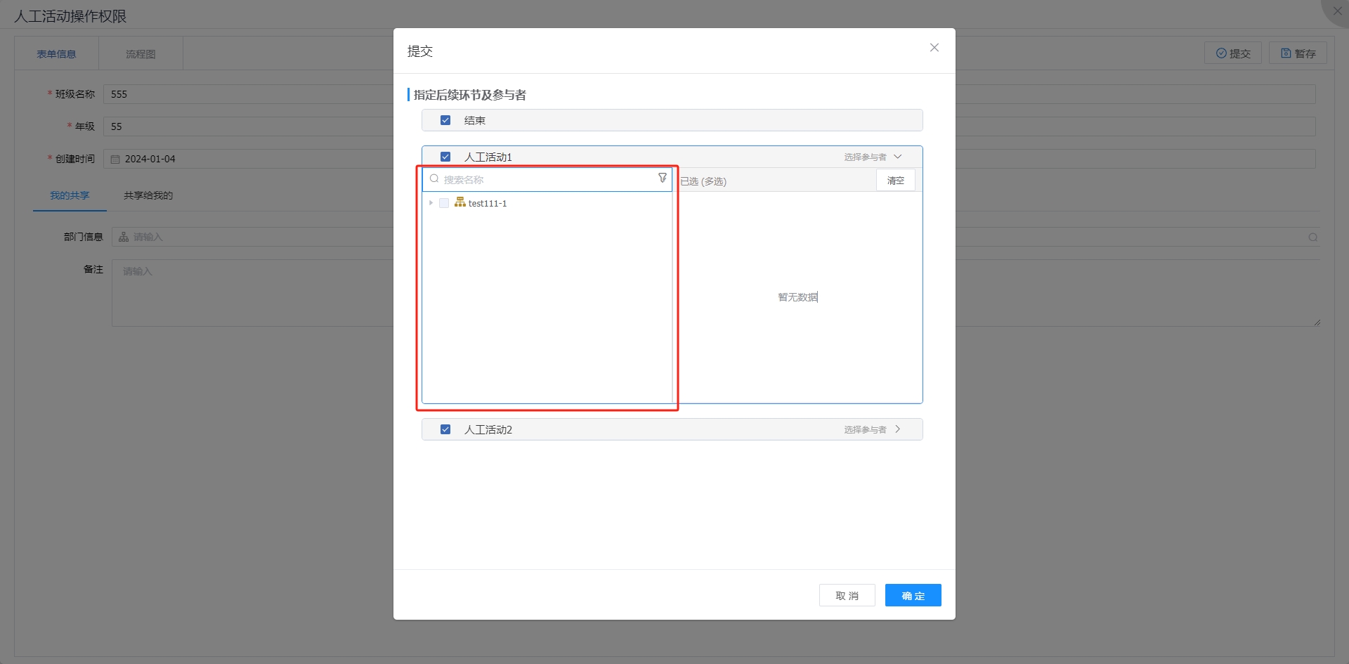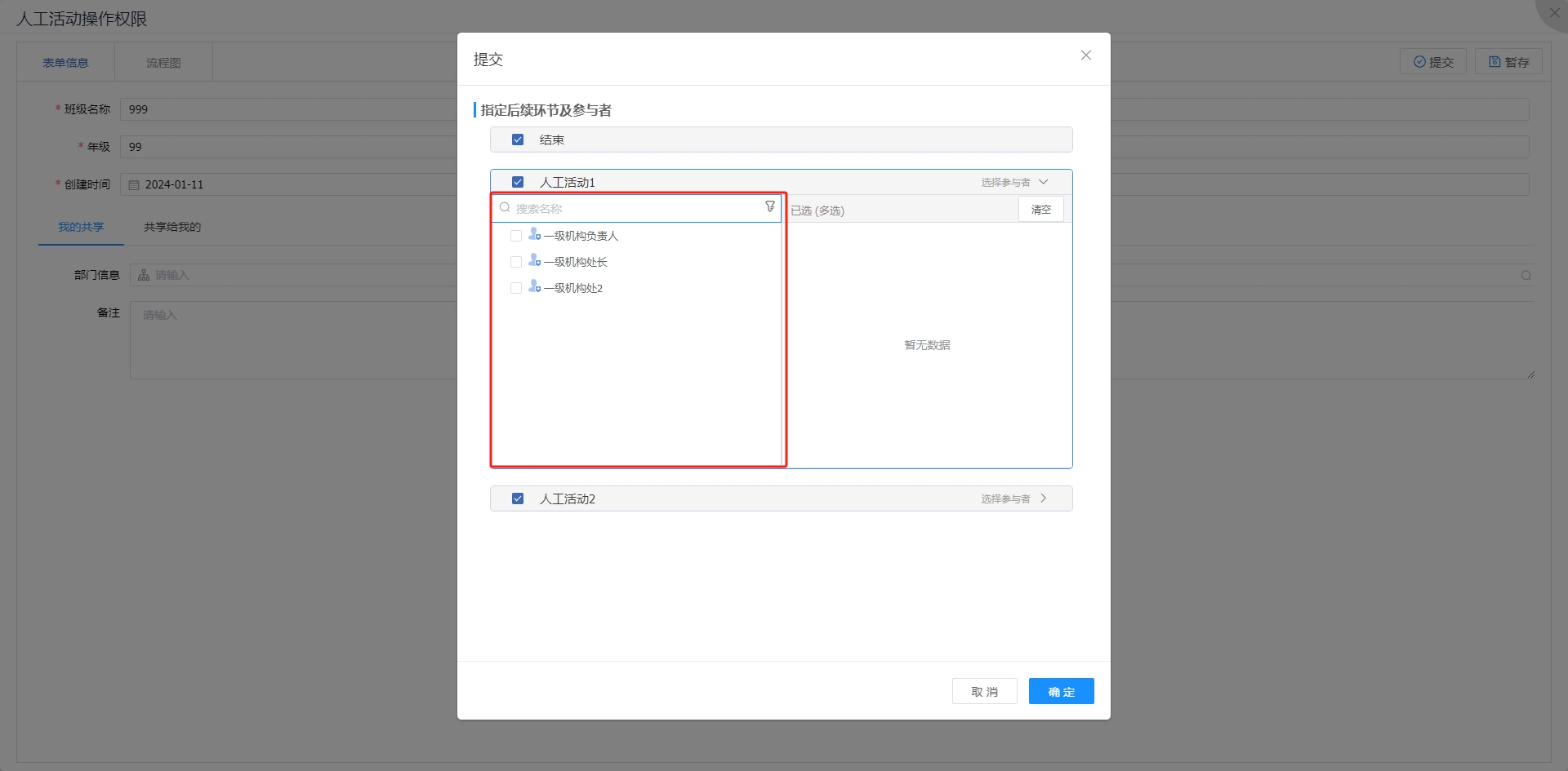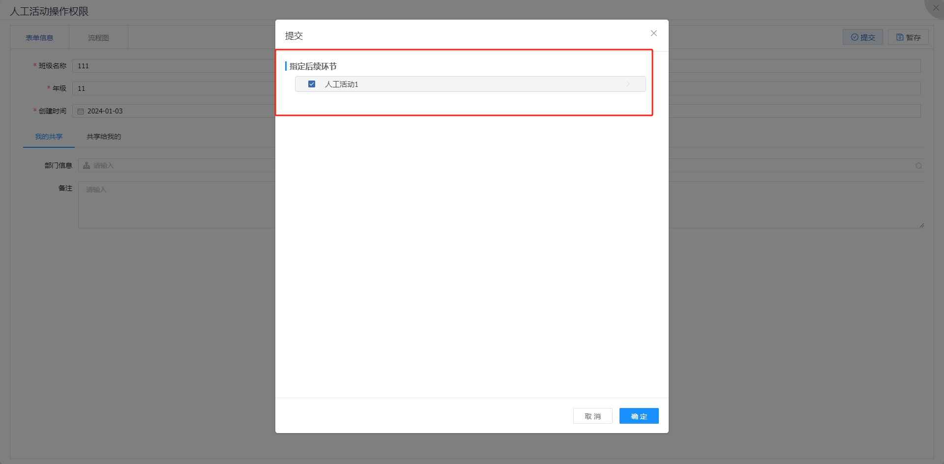 此时流程提交时,指定后续环节候选范围只展示人工活动1,如果需要同时展示所有指定后续环节,则需要配置自由流。