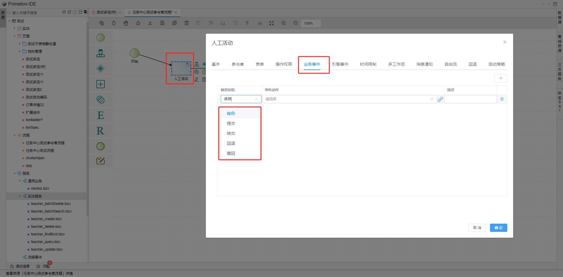 业务事件的事件动作,可以选择开发的逻辑流,在保存、提交、转交、回退、撤回时在应用端触发逻辑流调用。