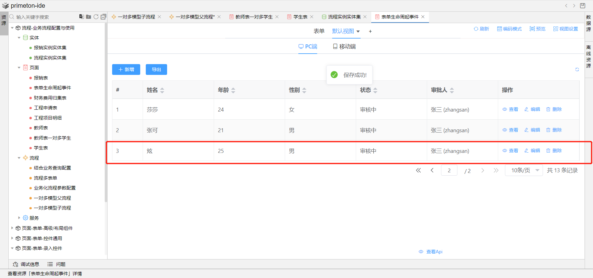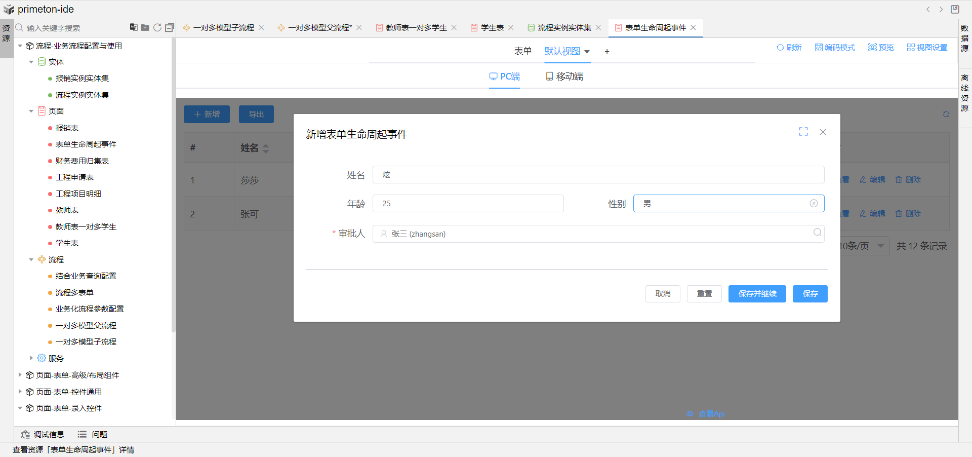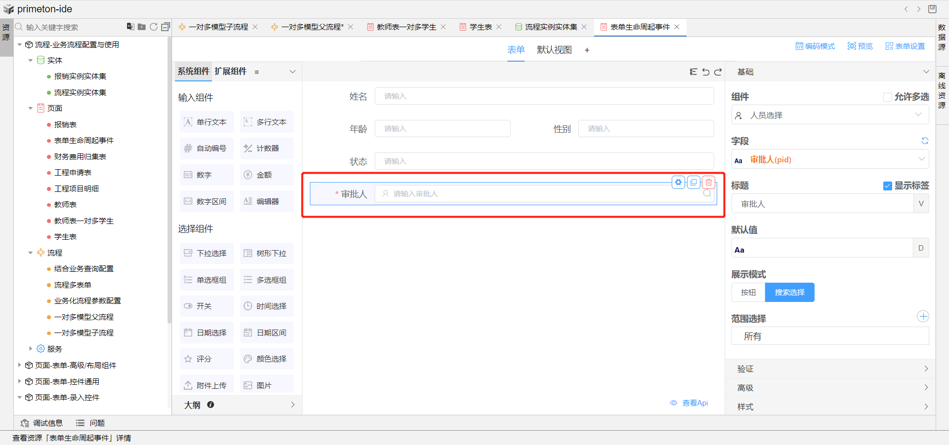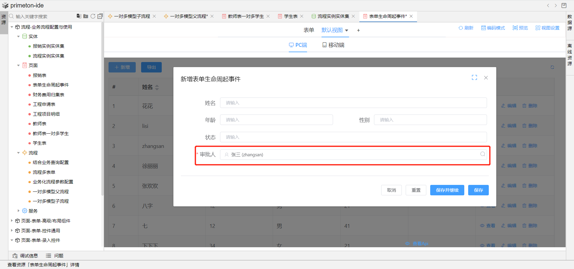 例如:新增数据时设置审核人(选人组件)为张三(也可以调用后端接口拿到数据为组件绑定的字段赋值)。