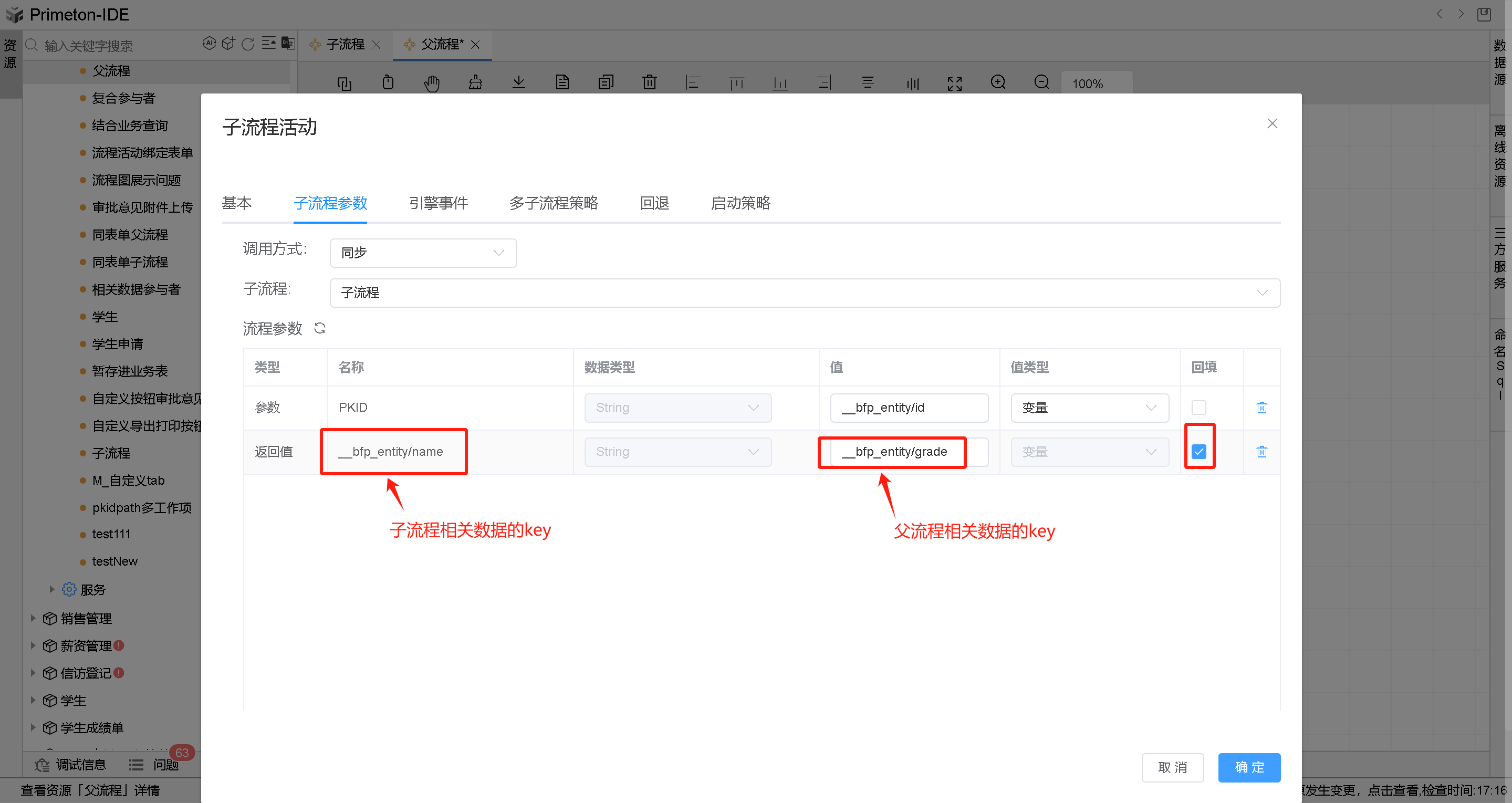 - 在子流程实例完成后会将相关数据中__bfp_entity/name的值设置到父流程实例相关数据的__bfp_entity/grade中去,这个是回填操作,当子流程参数中为勾选回填时,则不会进行对应值的传递。