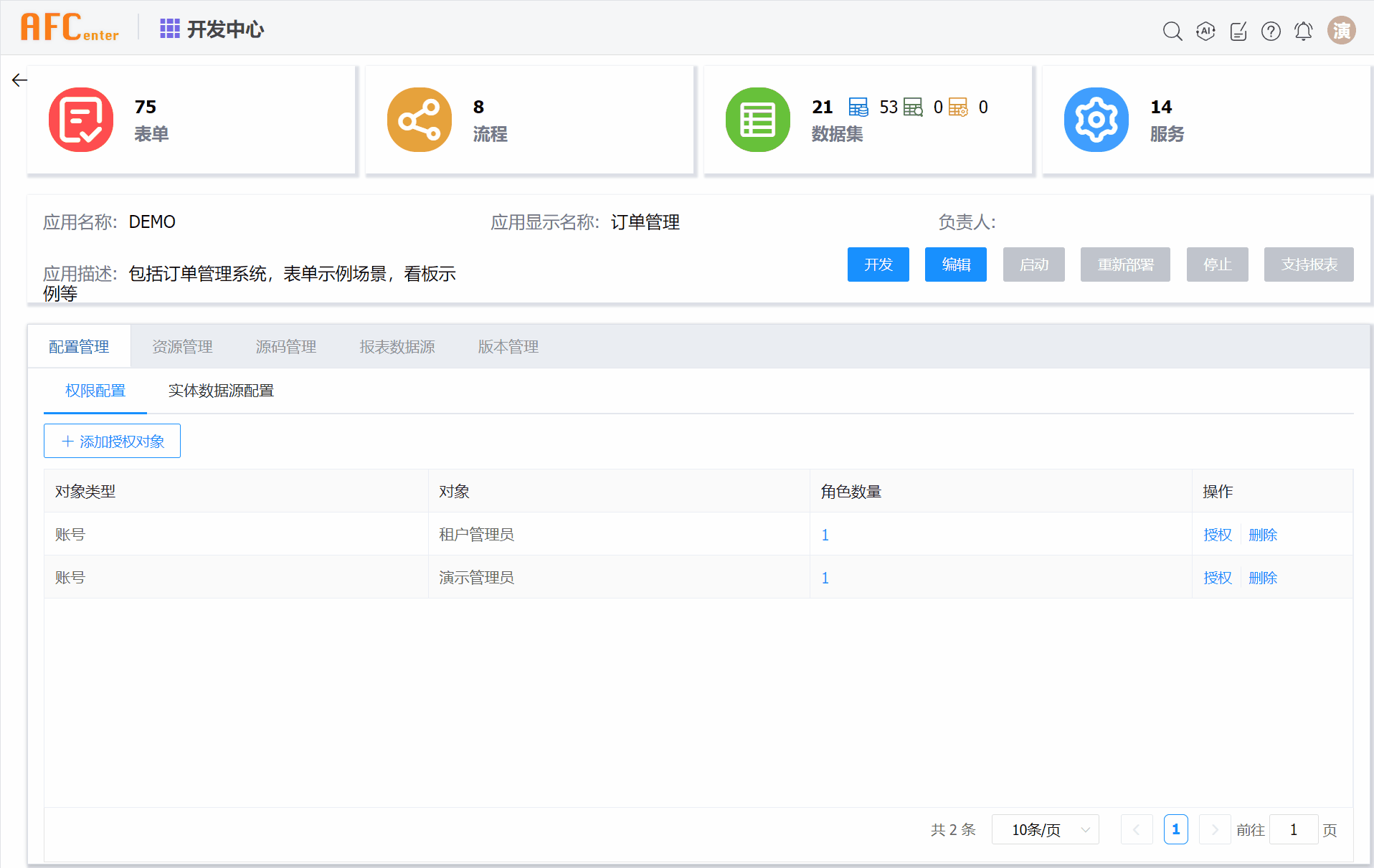 在跳转的页面中,单击配置管理>权限配置>添加授权对象。