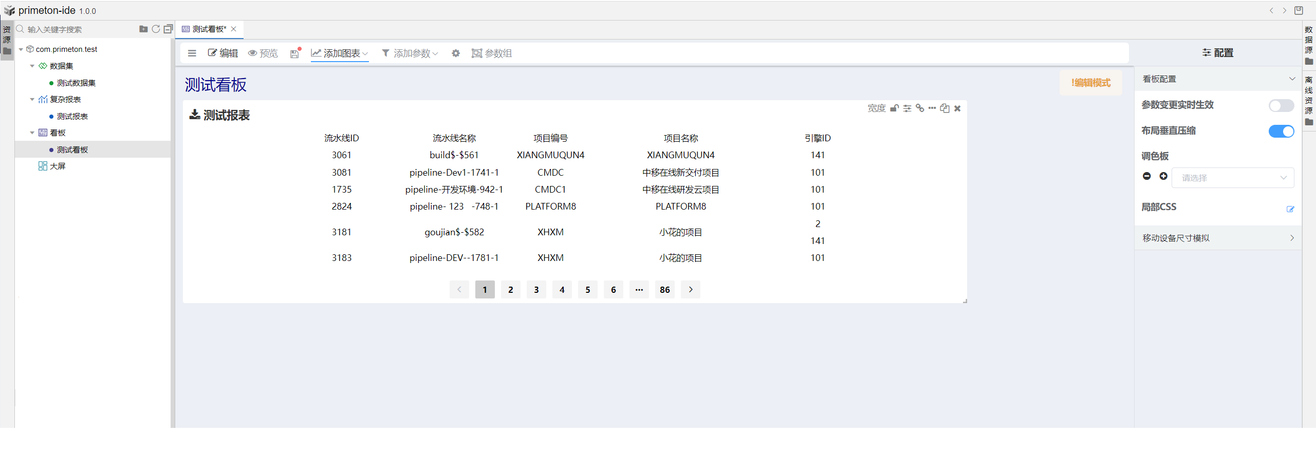 选择构件包com.primeton.test的节点大屏,右击创建大屏,填写信息,点击创建。