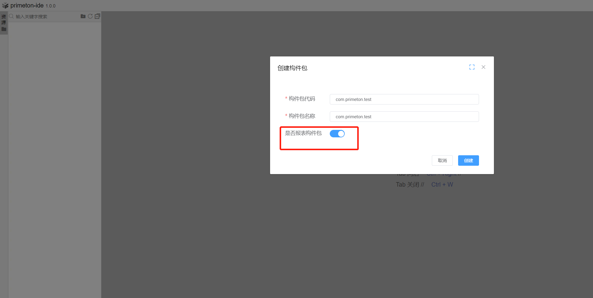 选择报表应用,进入报表应用在线开发的IDE界面。点击新建构件包,选择创建报表构件包。