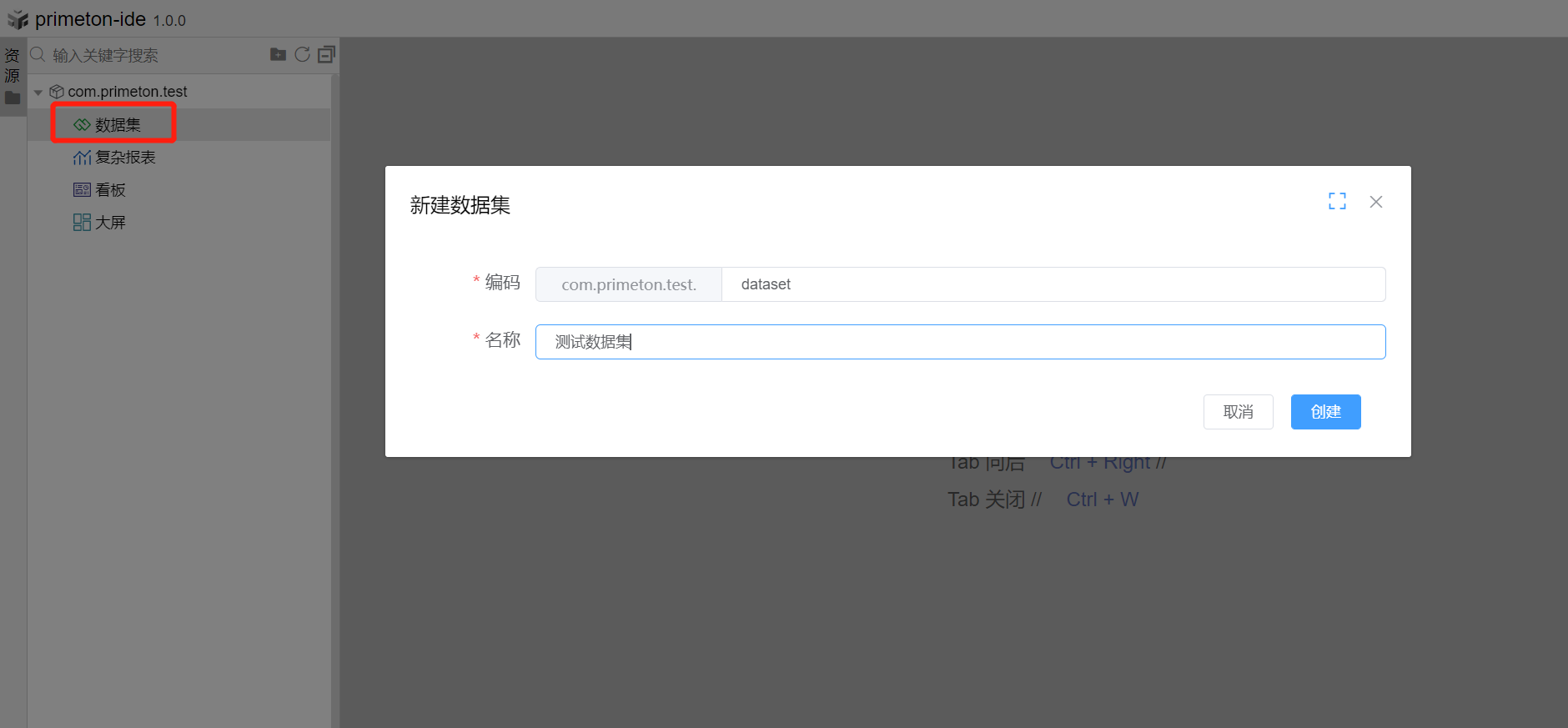 选择构件包com.primeton.test的节点数据集,右击创建数据集,填写信息,点击创建。