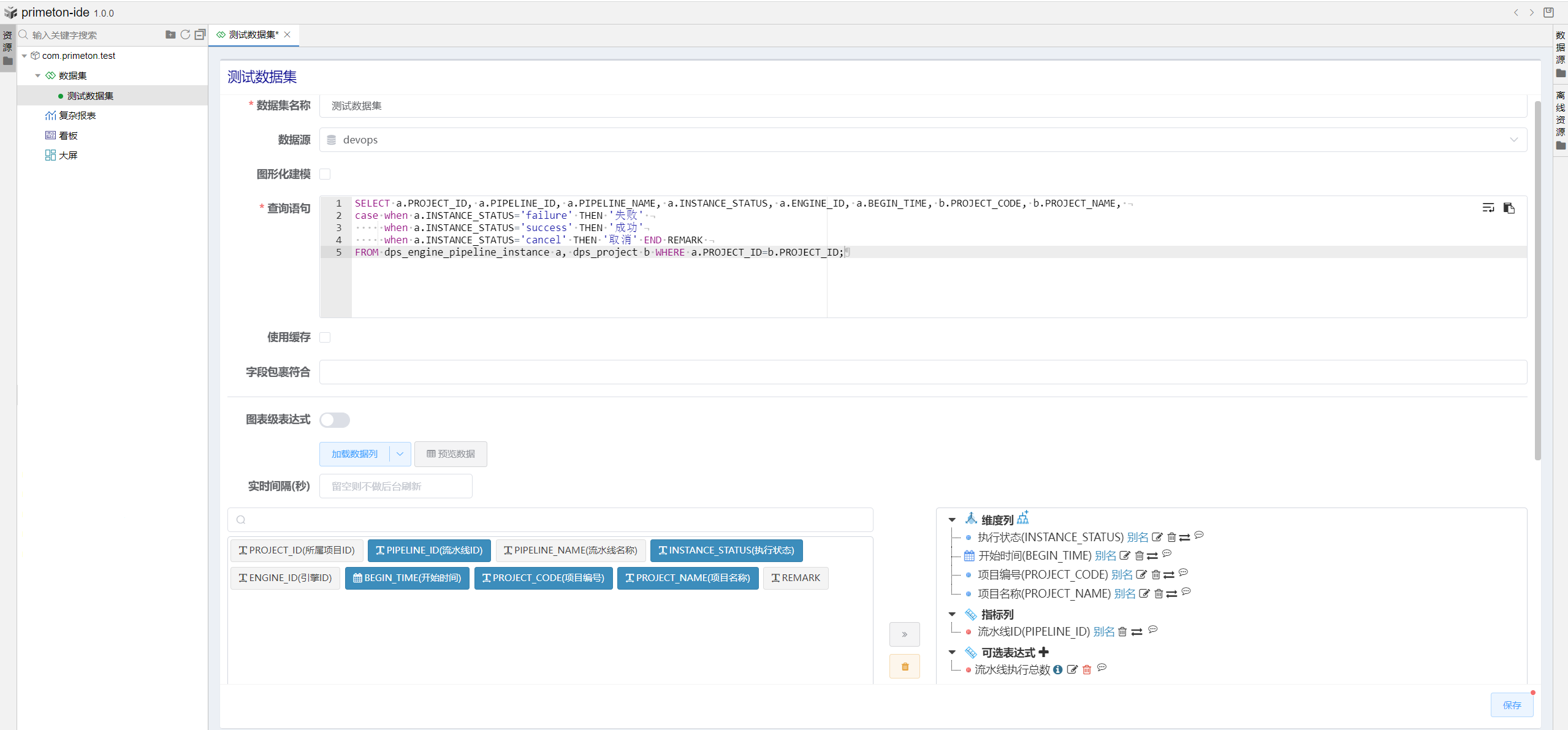 在新建的测试数据集中,选择创建的数据源,填写其他相关信息,具体开发详解请参考数据集配置 (opens new window)。