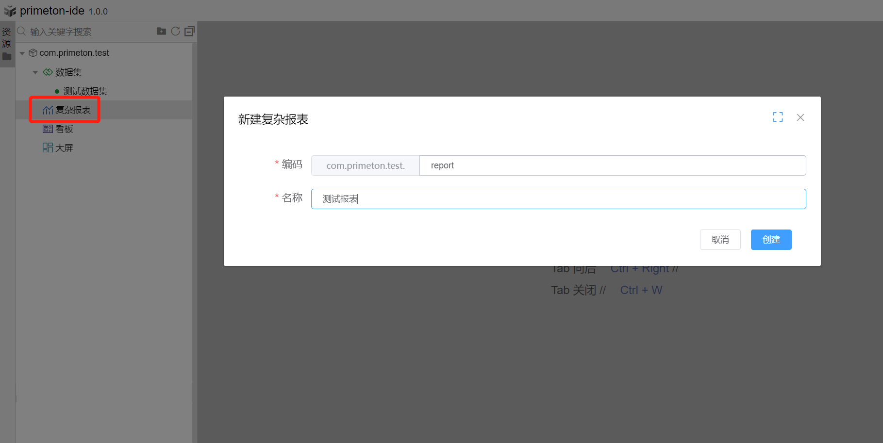 选择构件包com.primeton.test的节点复杂报表,右击创建复杂报表,填写信息,点击创建。